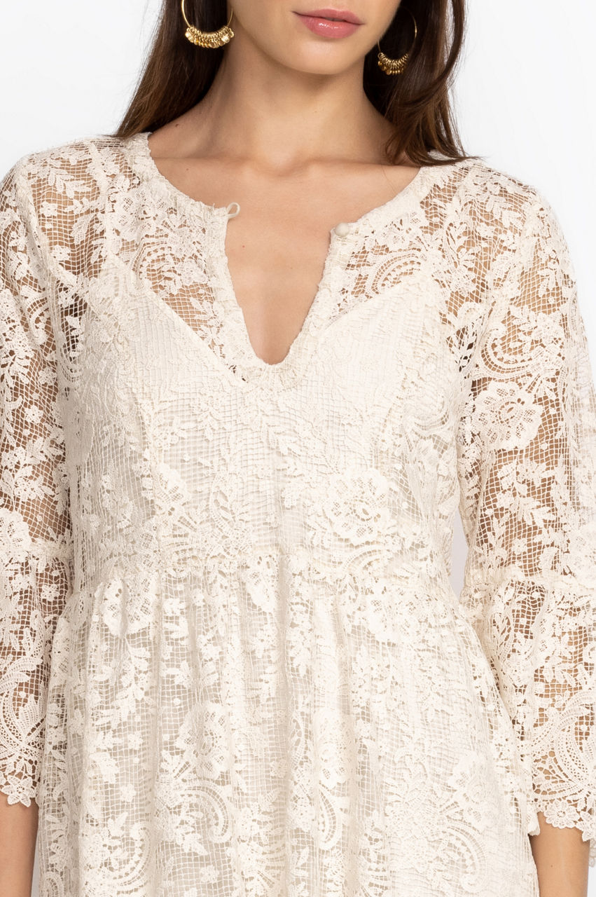 The Harper Recycled Lace Mini Dress allows you to safeguard the environment and look chic at the same time. Created from a combination of recycled and new fabrics, this tunic dress offers a tie-front neckline and romantic bell sleeves. Pair with ankle boots and sparking jewelry for brunch with friends.