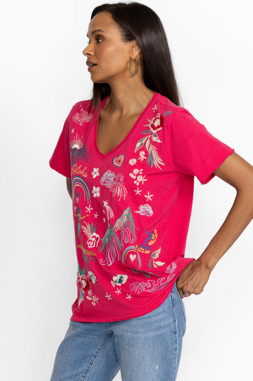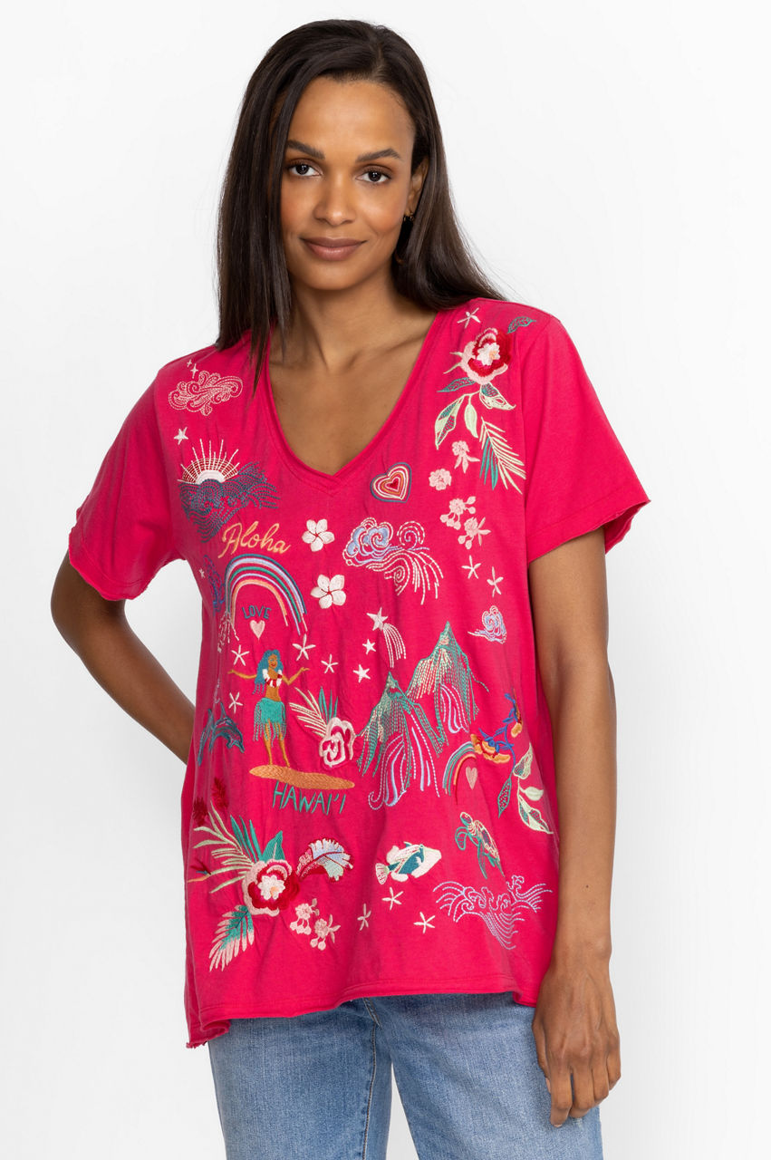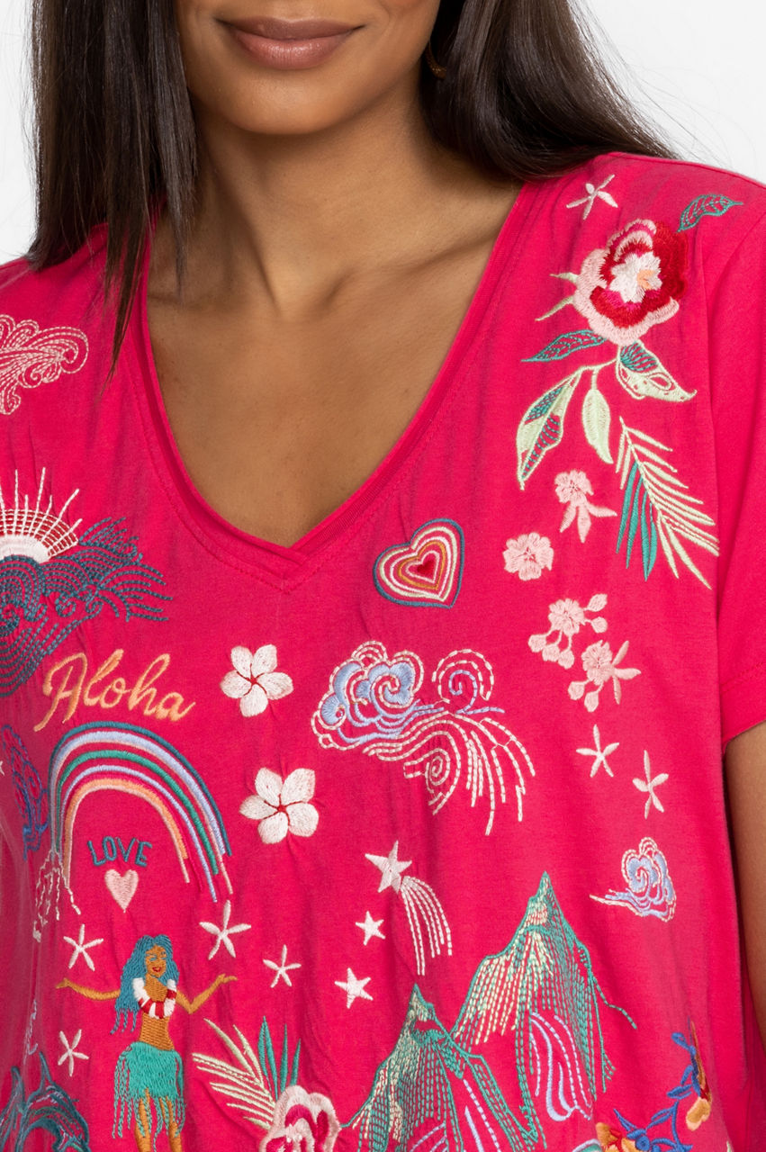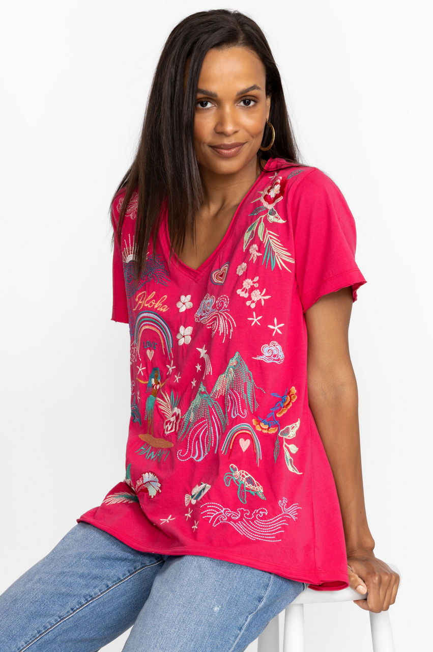 Offering a fresh representation of the aloha state, the Hawaii Everyday Tee is as vibrant and colorful as the state itself. Featuring a V-neckline and capped sleeves, the relaxed fit tee is embellished with intricate embroidered flora and fauna. Pair with linen shorts and leather sandals for an easy, casual look.