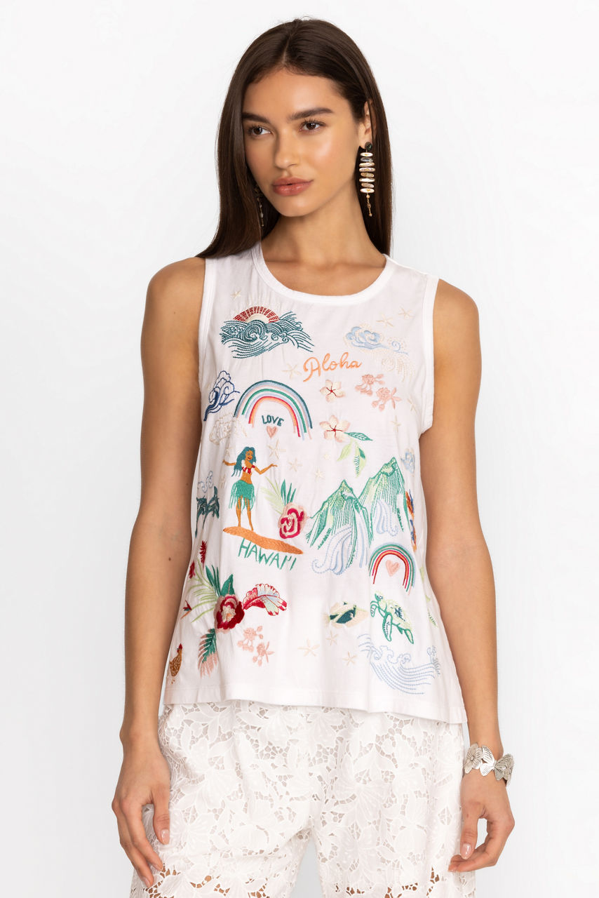 Crafted from 100% breathable cotton, the Hawaii Knit Tank features the flora and fauna of the Aloha State exemplified in intricate placement embroidery. Featuring a high boatneck neckline and racer back, this breezy tank is finished with a generous swing hemline. Pair with colorful shorts and slip-on sandals for a playful weekend look.