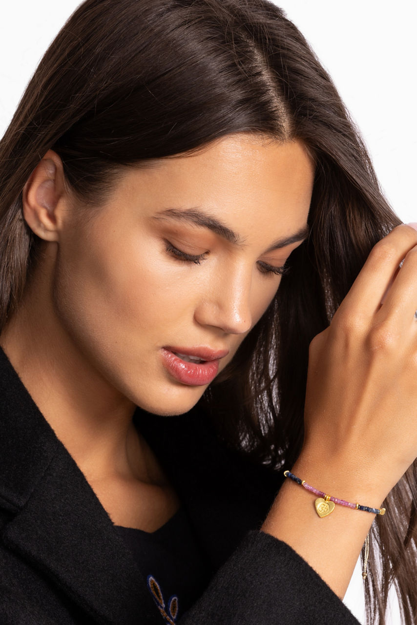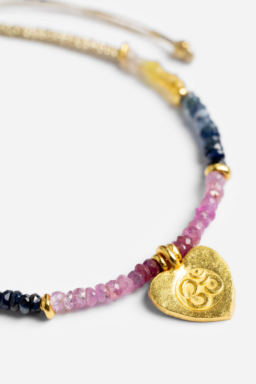 The Heart Om Pendant Bracelet features Gold-accented sapphire macrame. This blends artisanal craftsmanship with elegant gemstone hues, perfect for stacking or wearing solo. Complement your look by pairing this bracelet with denim and a white blouse for casual chic, or stack it with metallics for a more layered statement.