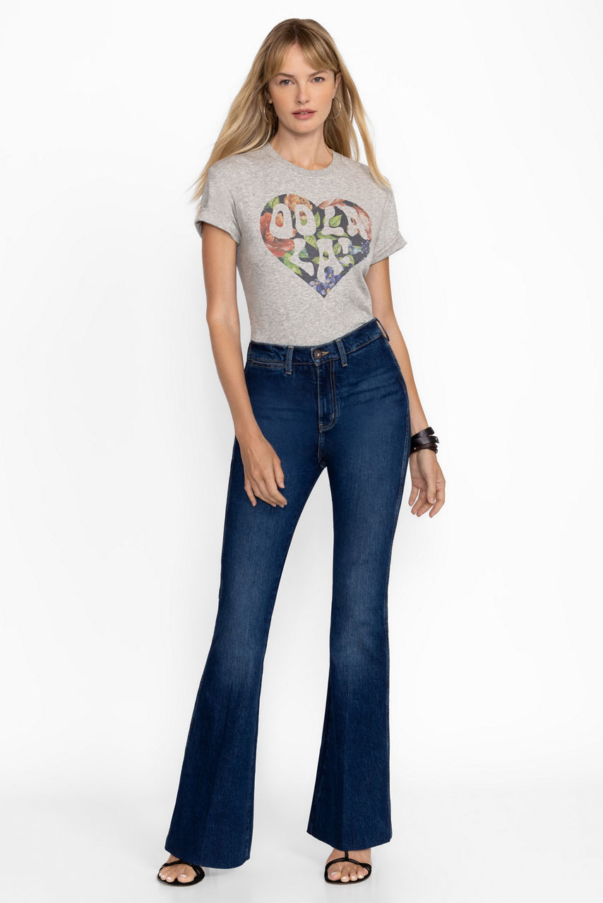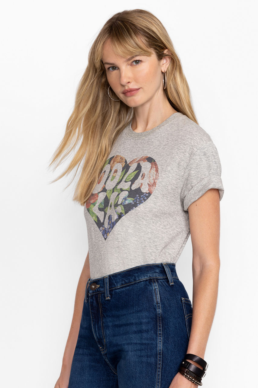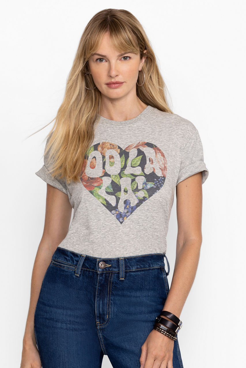 The Heart Oolala Tee is not your basic t-shirt. Adorned with a charming graphic print featuring Sasson's classic slogan inside a JW floral heart, it's the perfect casual cool piece to add a sense of romance, femininity, and edge into any ensemble. Pair it with with our Johnny Was x Sasson denim and fashion sneakers to look effortlessly put together or a chic blazer and flats for a tailored look.