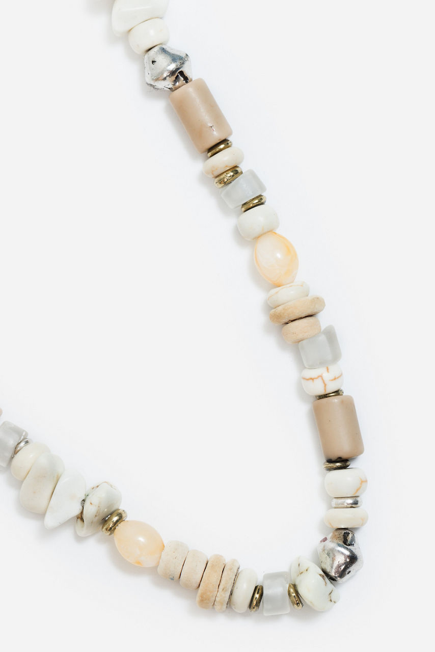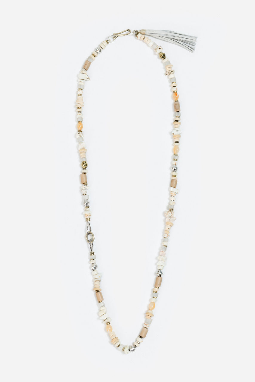 Thoughtfully crafted with an array of color and texture, the Heart Pendant Stone and Metal Necklace offers an eclectic look. Featuring a visually stunning variety of stone beads, this unique necklace displays a metal pedant paired with a decorative tassel and is finished with a clasp closure. Pair with a relaxed linen palazzo pant and coordinating top in natural colors to allow this necklace to shine.