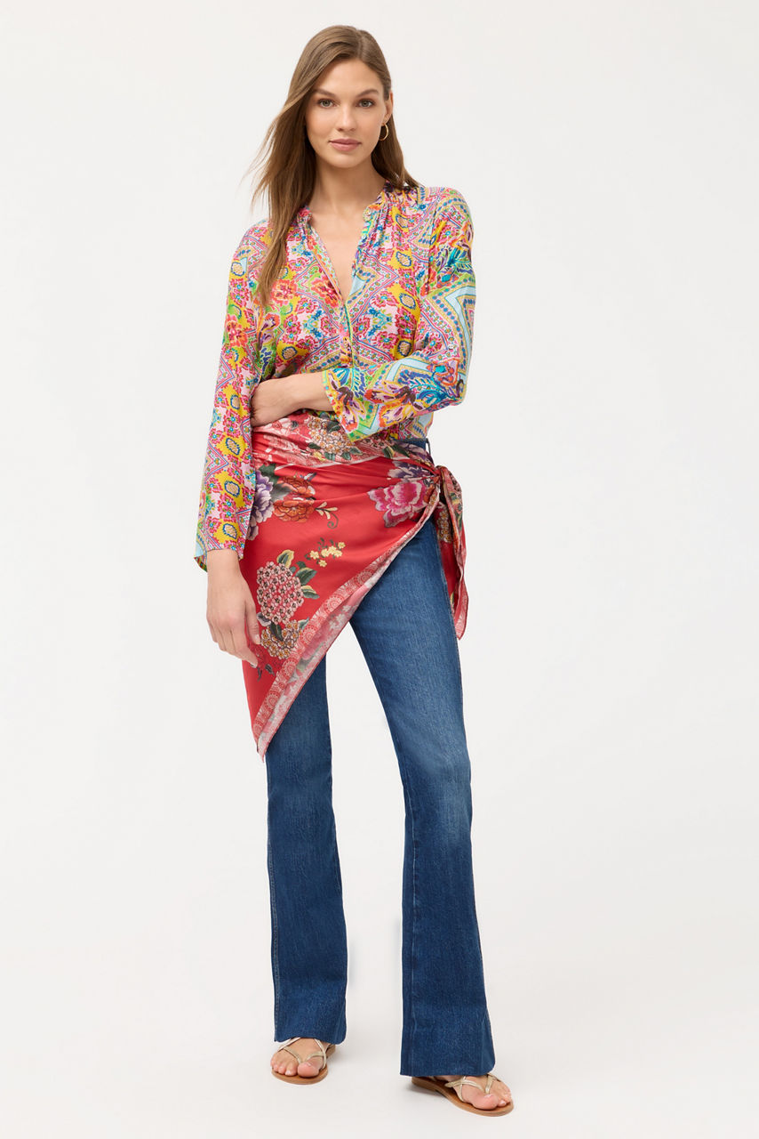Crafted from 100% rich silk, the Heaven Button Up is adorned with vibrant color in a kaleidoscope of pattern. Designed with a classic button-front with gathers at the neckline, this V-front top is finished with a curved hemline and roll-tab sleeves. Pair with dark wash denim and casual loafers for a weekend lunch date with friends.