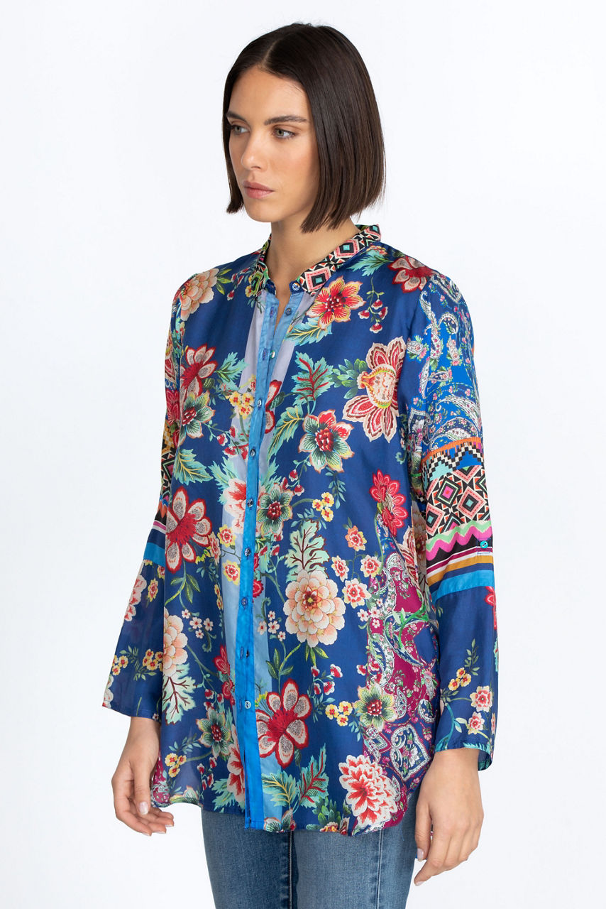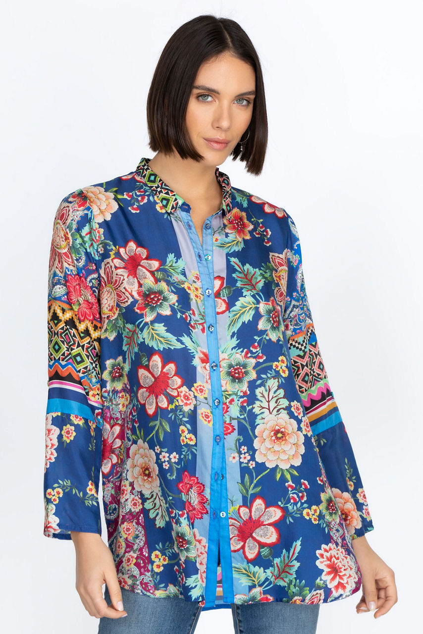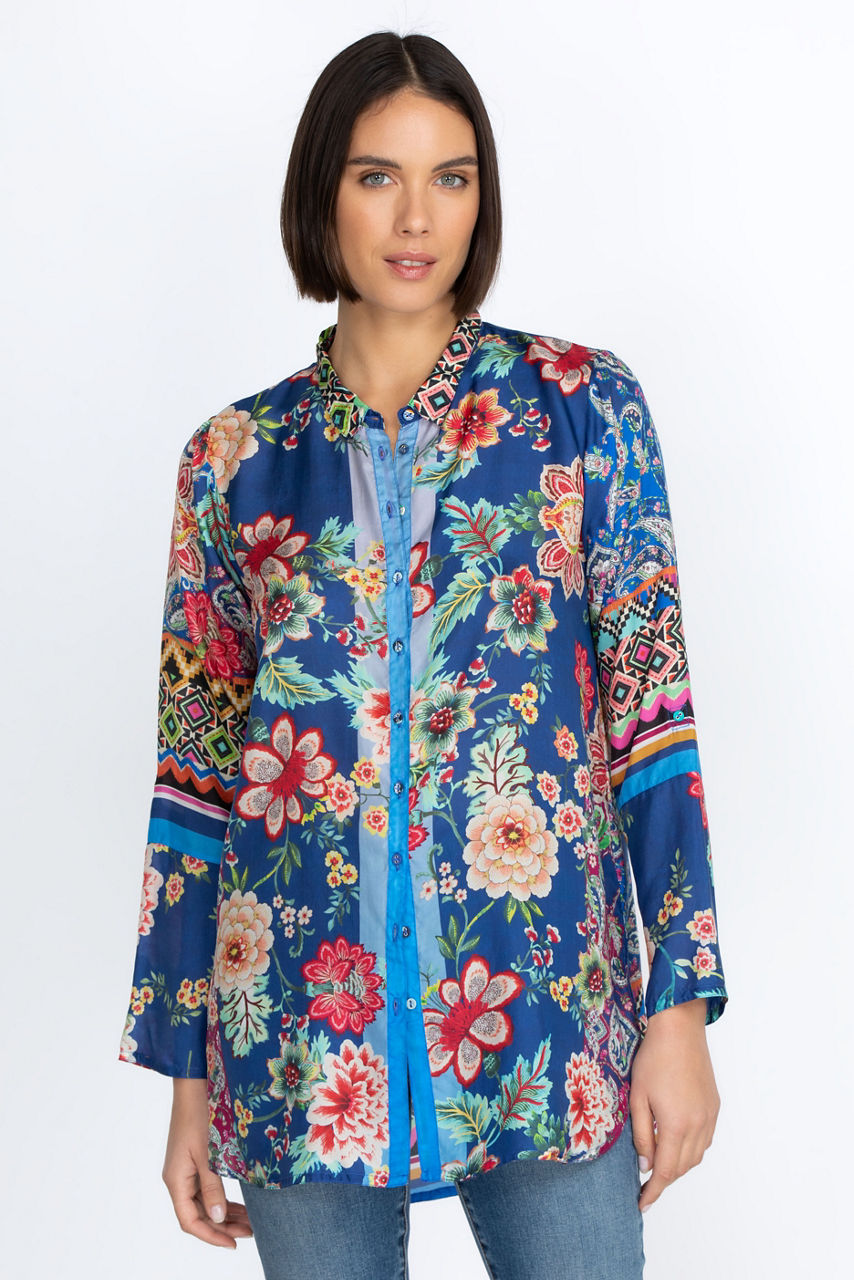 A chic yet casual choice for day-to-day dressing, the Hebea Delia Tunic is enhanced with vibrant, vintage-inspired florals. This tunic is cut in a regular fit and spun from lustrous silk, a practical choice for both cooler and warmer days. Finished with a button front and three-quarter length sleeves, this tunic can be styled over pants for a sophisticated finish.
