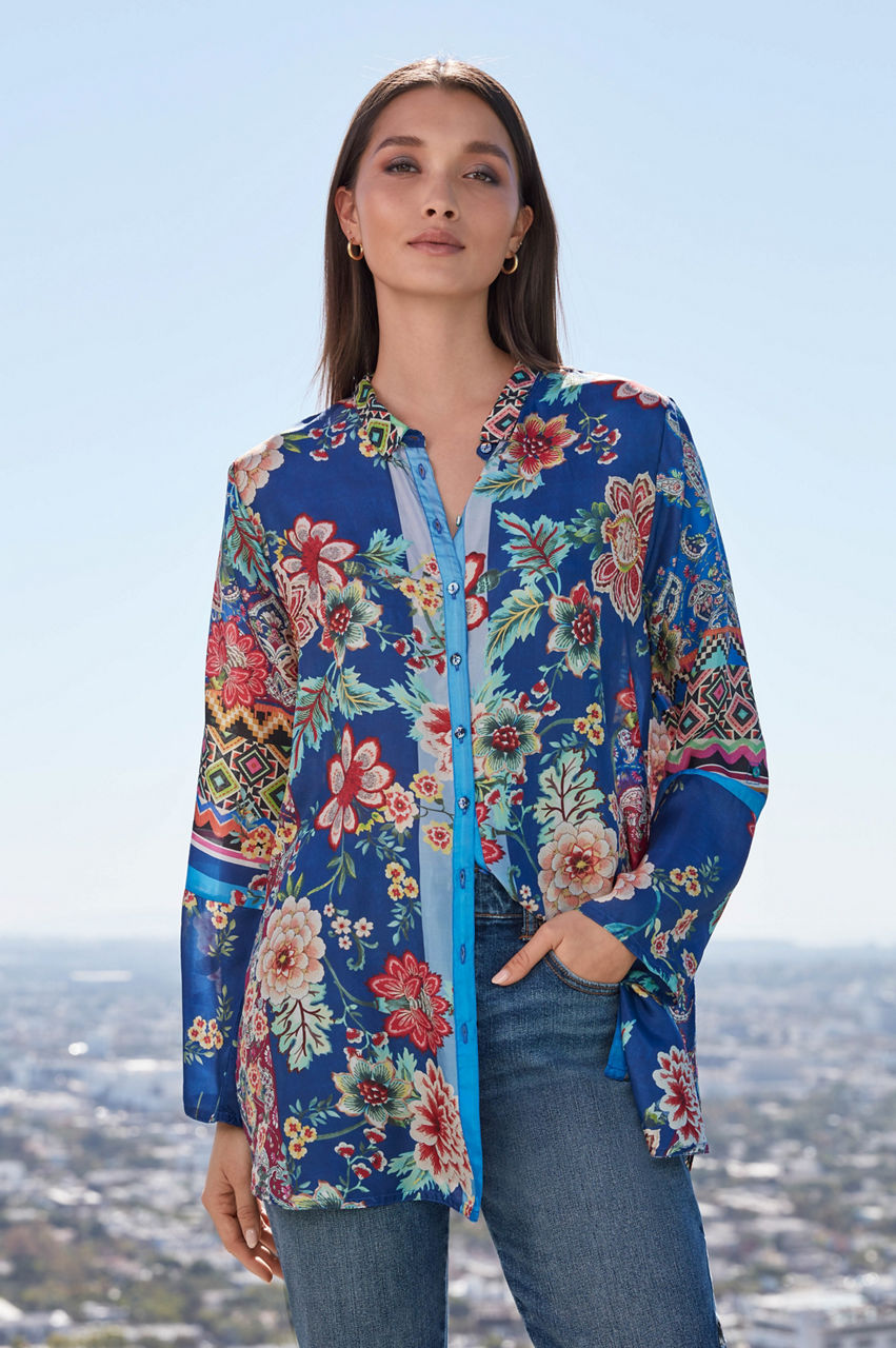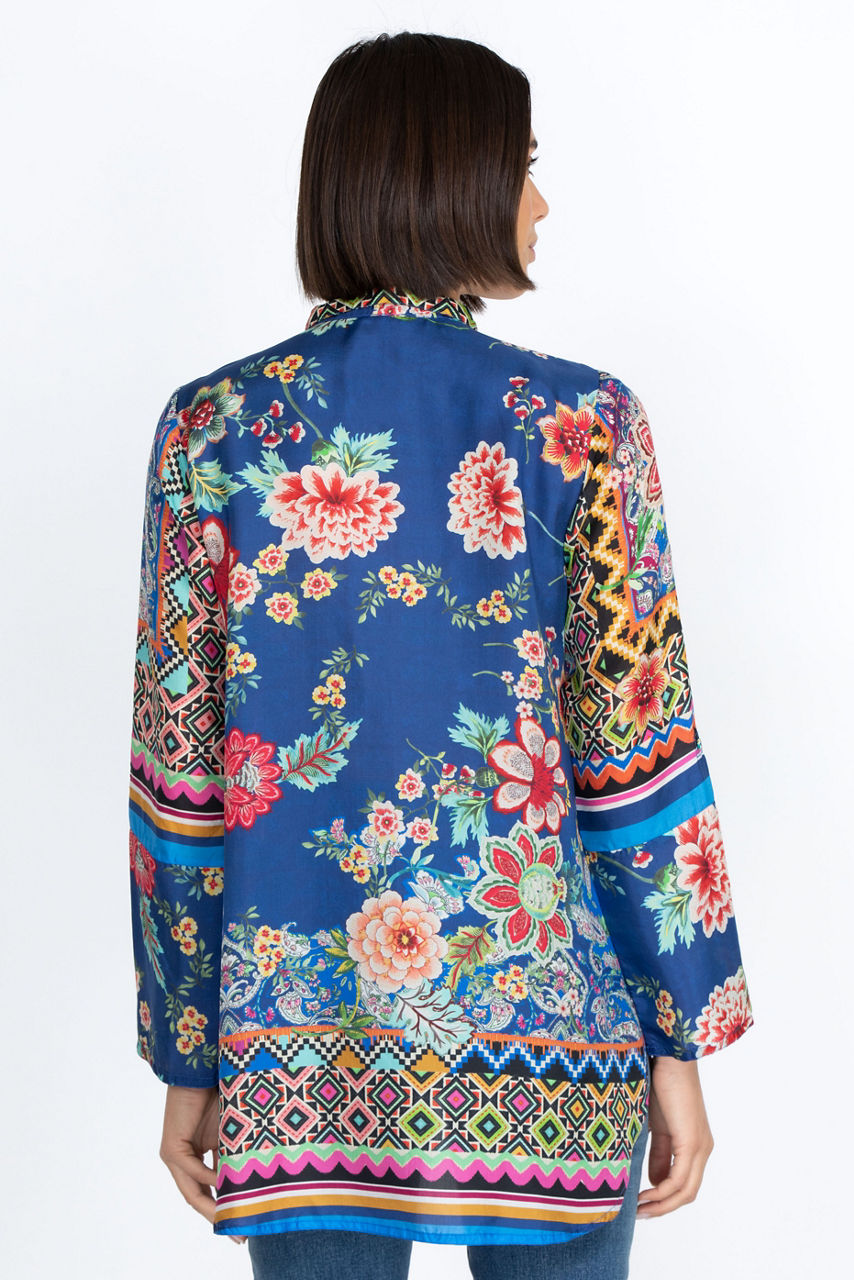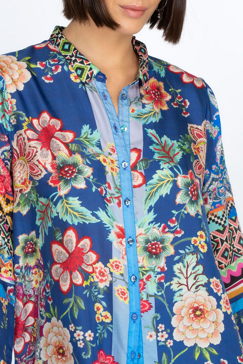 A chic yet casual choice for day-to-day dressing, the Hebea Delia Tunic is enhanced with vibrant, vintage-inspired florals. This tunic is cut in a regular fit and spun from lustrous silk, a practical choice for both cooler and warmer days. Finished with a button front and three-quarter length sleeves, this tunic can be styled over pants for a sophisticated finish.