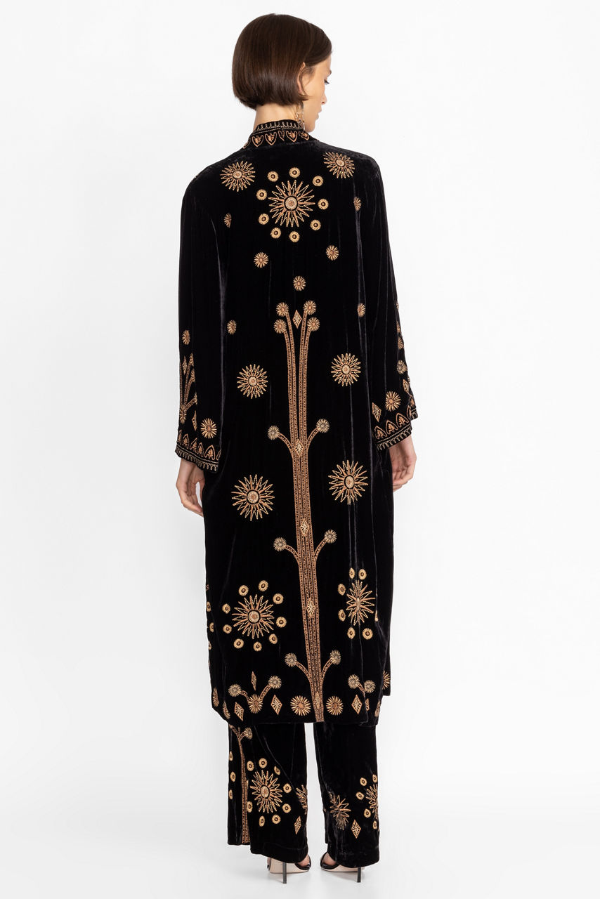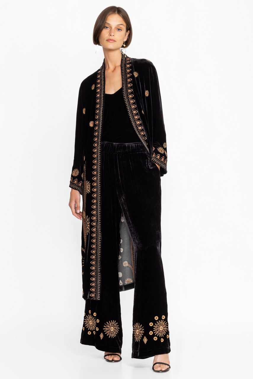 Providing a luxe layer for cooler days, the Heidi Velvet Kimono Coat adds stunning detail to any look. Crafted from a unique silk blend, this velvety midi-length coat is highlighted with intricate placement embroidery. Layer over a classic little black dress and add sparkling heels for an evening out.