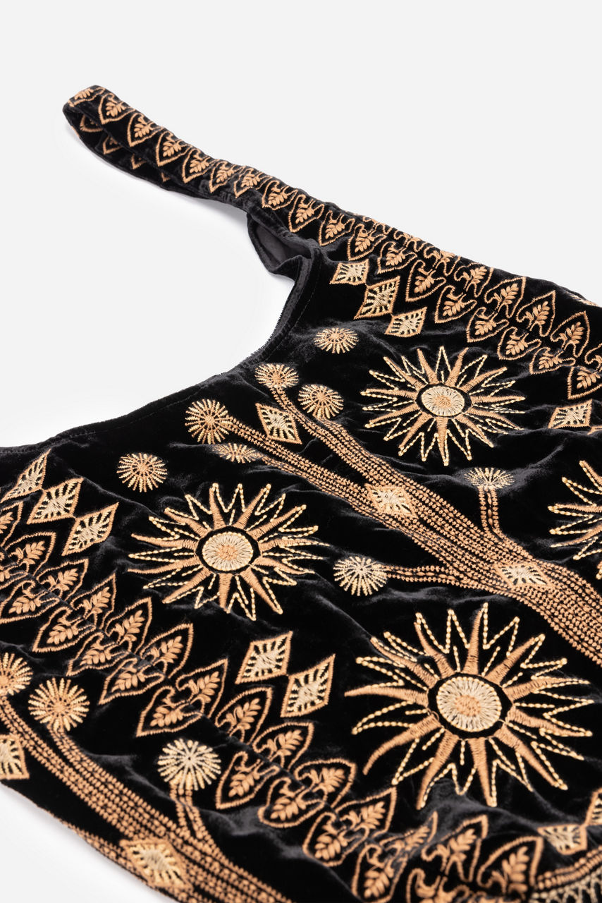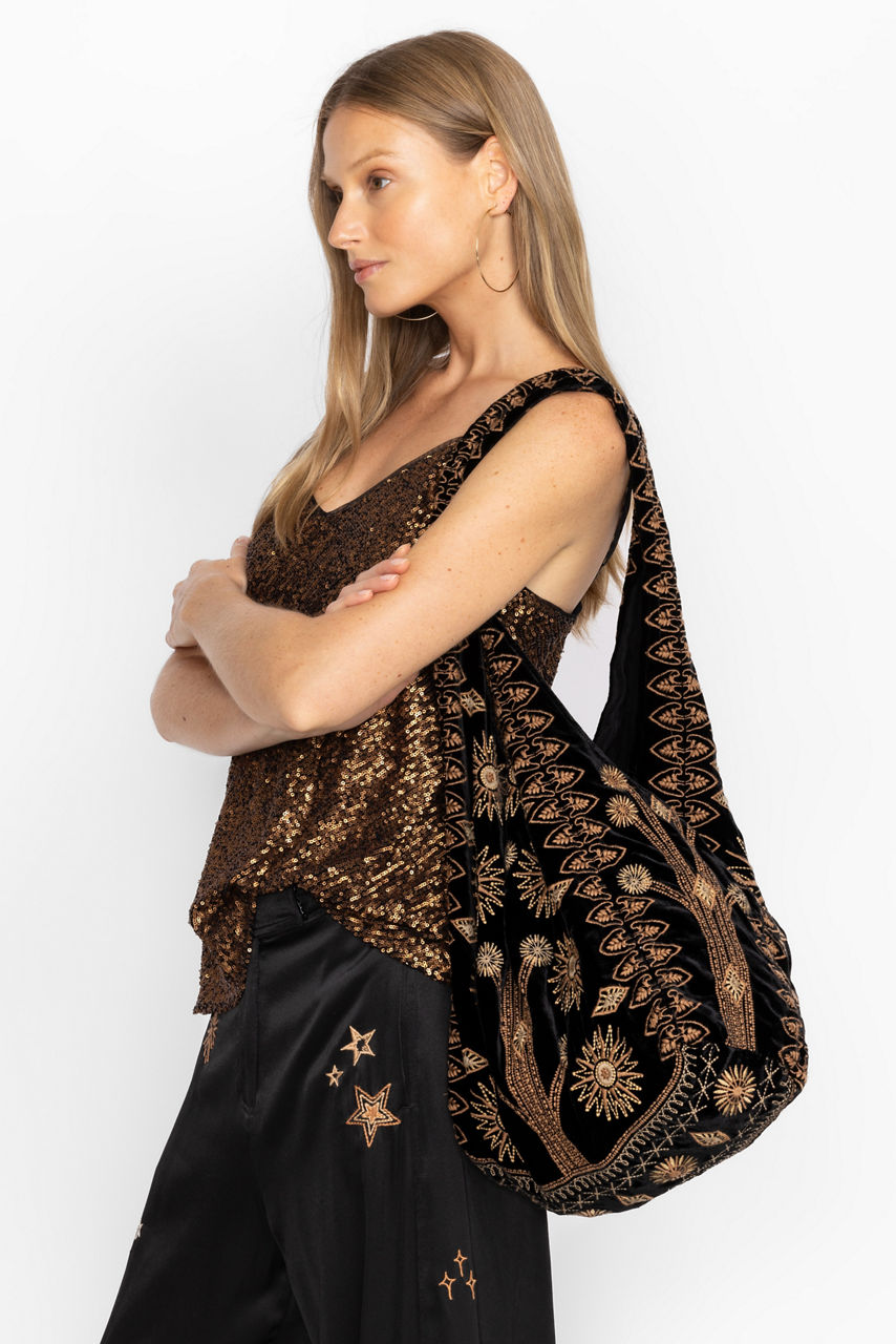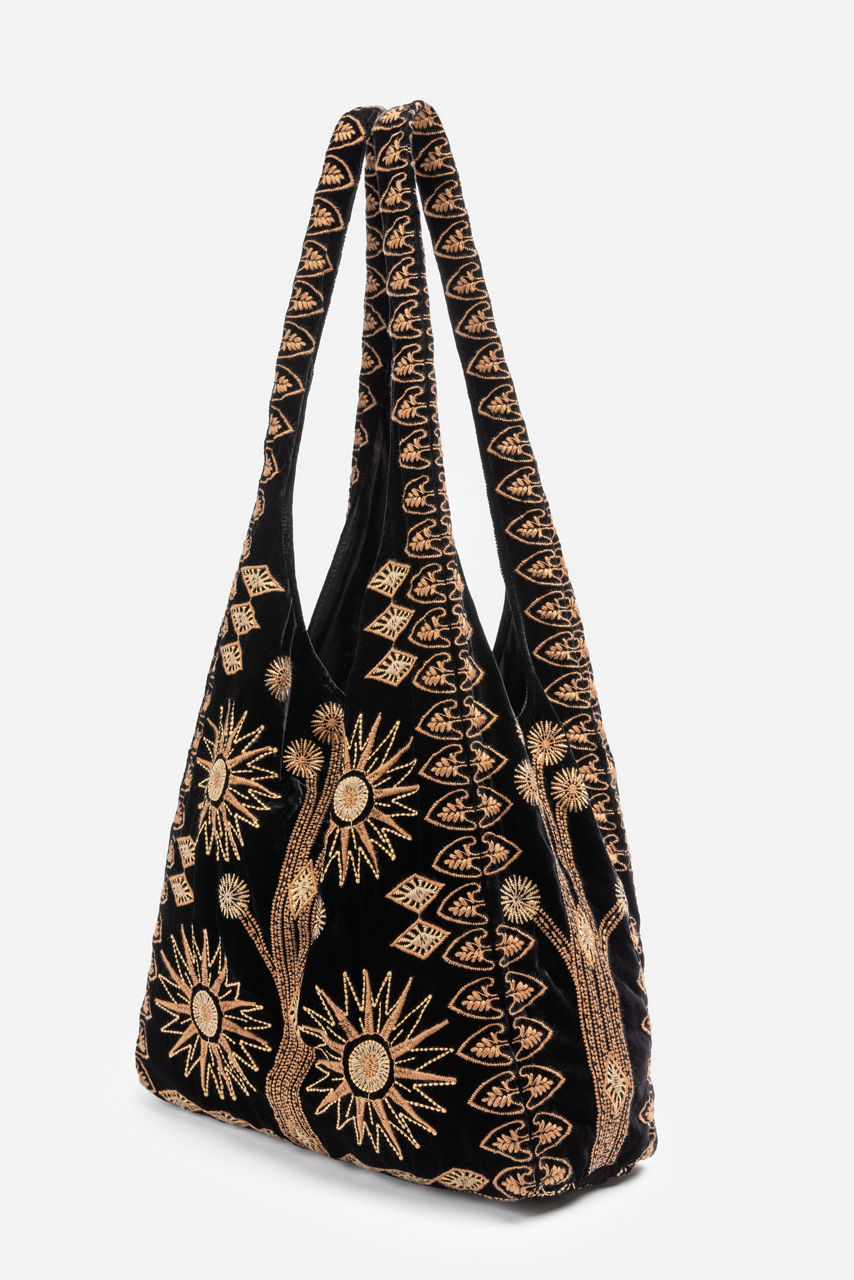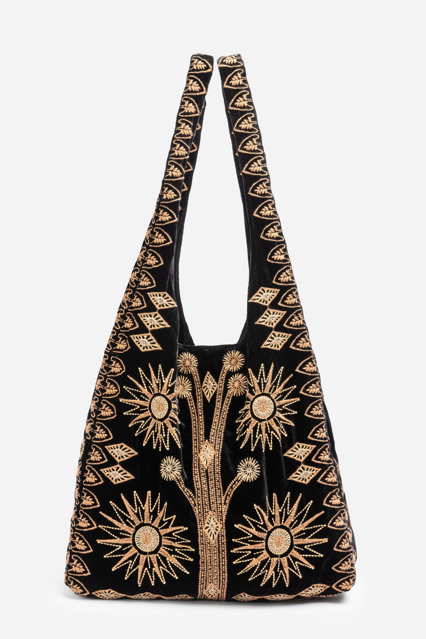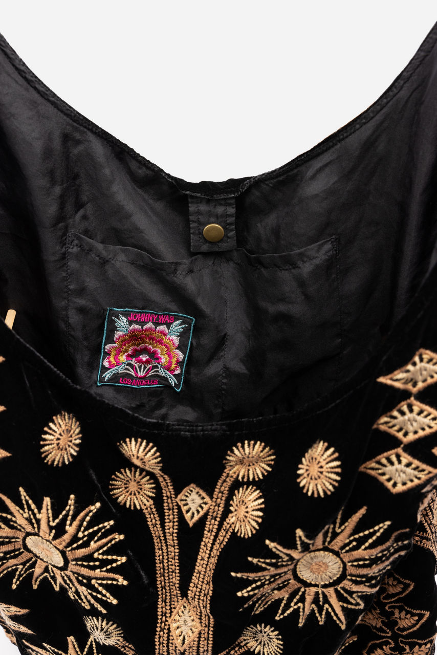 Infusing your daily look with a unique bohemian flair, the Heidi Velvet Slouchy adds texture and unmistakable beauty. Crafted from a unique silk blend velvet fabric, this bag features intricate placement embroidery and an easy snap closure. Add to a crisp white button-down and dark wash denim for a polished casual weekend look.