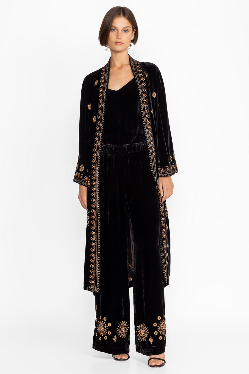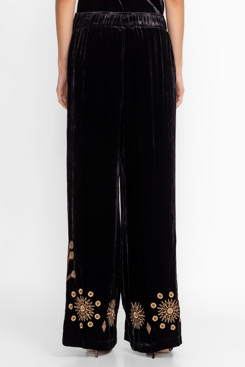 Delivering decadent style and a flowing silhouette, the Heidi Velvet Wide Leg Pants redefine elevated dressing. Crafted from a rich velvety silk blend fabric these comfortable elastic waist pants feature usable pockets and a stunning embroidered border. Pair with a metallic blouse and the Heidi Kimono Coat for a new take on dazzling evening wear.