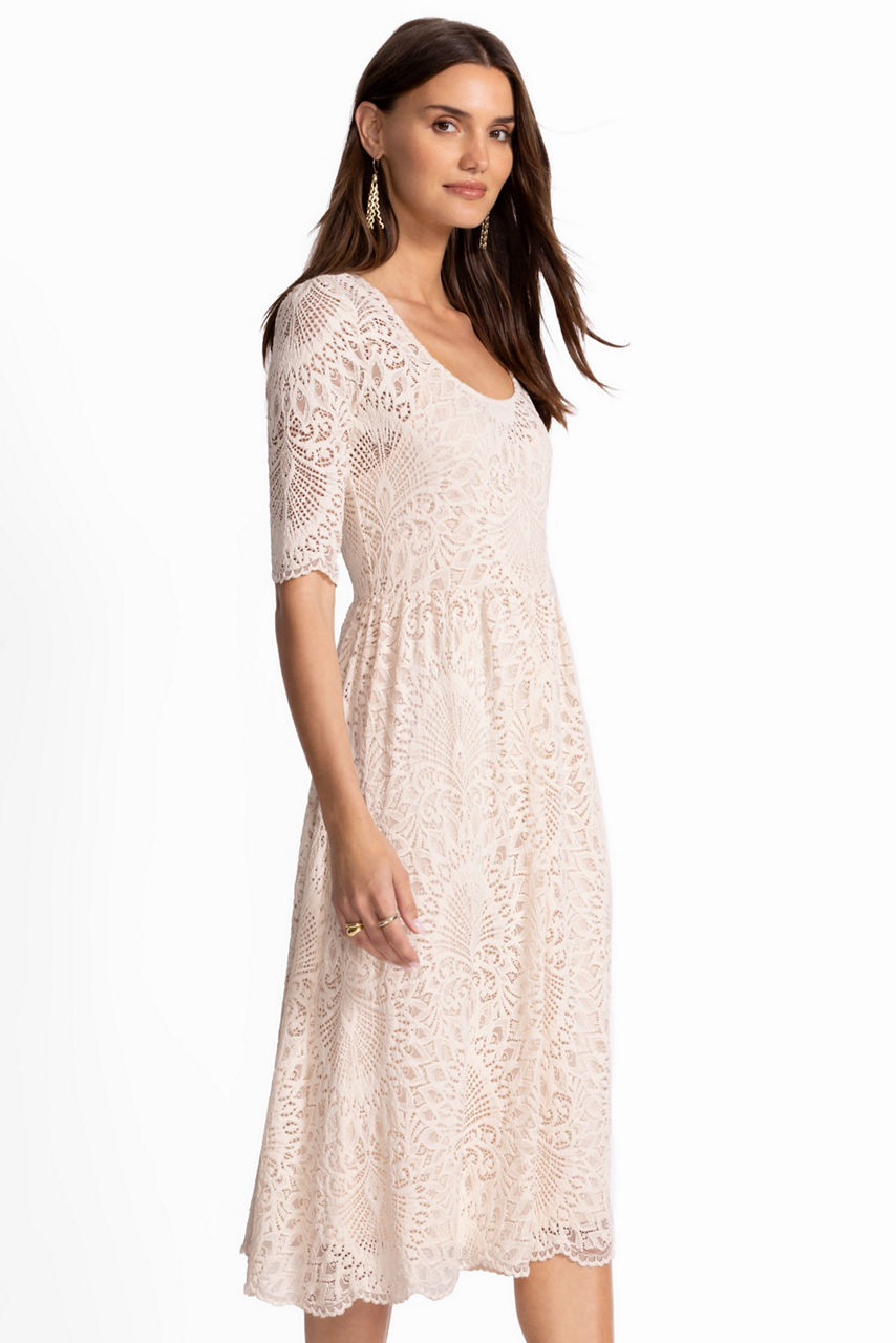 The Helena Midi Dress is crafted from a lightweight fabric in a distinctively feminine silhouette. Designed with a lace shell and scalloped detailing at the hems and sleeves, this slip-lined dress is finished with an elastic waist and A-line midi skirt. Pair with delicate gold jewelry and classic pumps for a polished evening ensemble.
