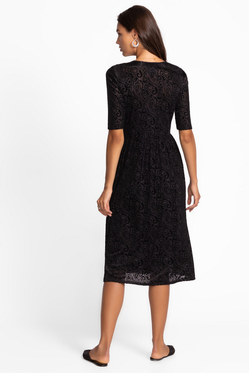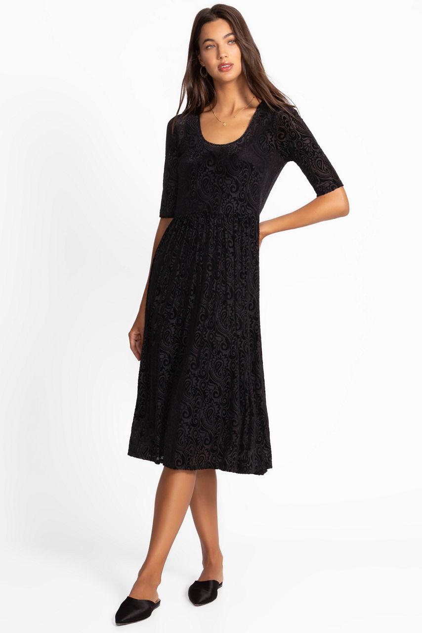 The Helena Midi Dress offers a fresh take on the classic fit-and-flare silhouette. Designed with a scoop neckline and elbow length sleeves, this slip-lined dress features a fitted bodice with a skirt that flows away from the body. Pair with classic pumps and delicate jewelry for a polished retro-inspired evening look.