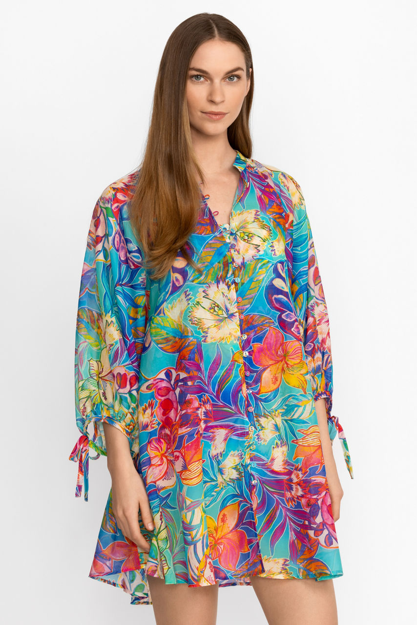 Crafted from a luxurious blend of cotton and silk, the Helena Mini Dress offers bold color in a lightweight dress. Featuring a V-neckline and relaxed raglan sleeves finished with a delicate drawstring, this vibrant swing dress is perfect for the warmest days. Layer over Helena swimwear for a posh coverup, or wear as a stand-alone style for a vibrant brunch look.