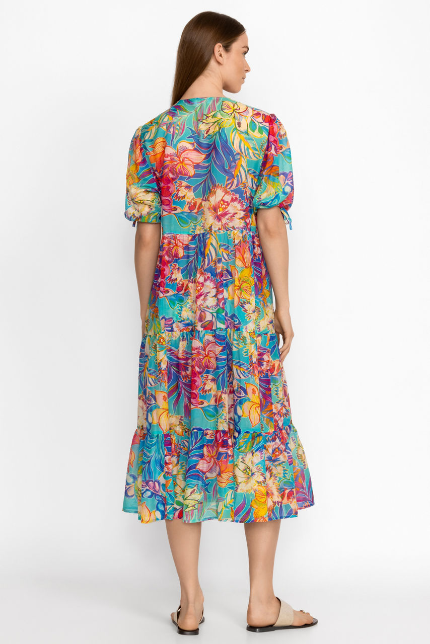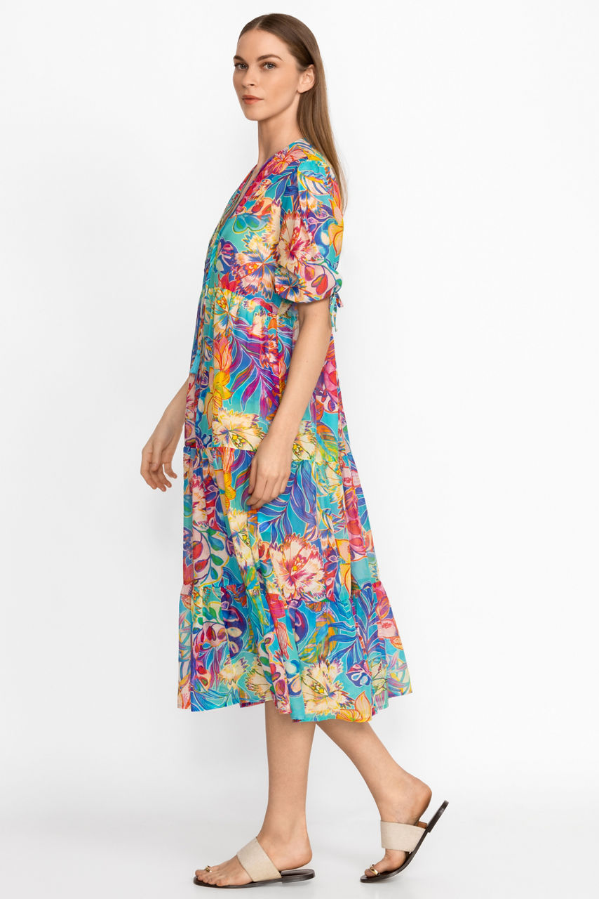 Crafted from a luxurious silk and cotton blend, the Helena Tiered Maxi Dress is the epitome of refined resort wear. Featuring a V-neckline and gently puffed sleeves, this dress offers an empire waist and a tiered maxi skirt in bold saturated color. Wear in combination with Helena swimwear pieces as a coverup or as a stand-alone style.