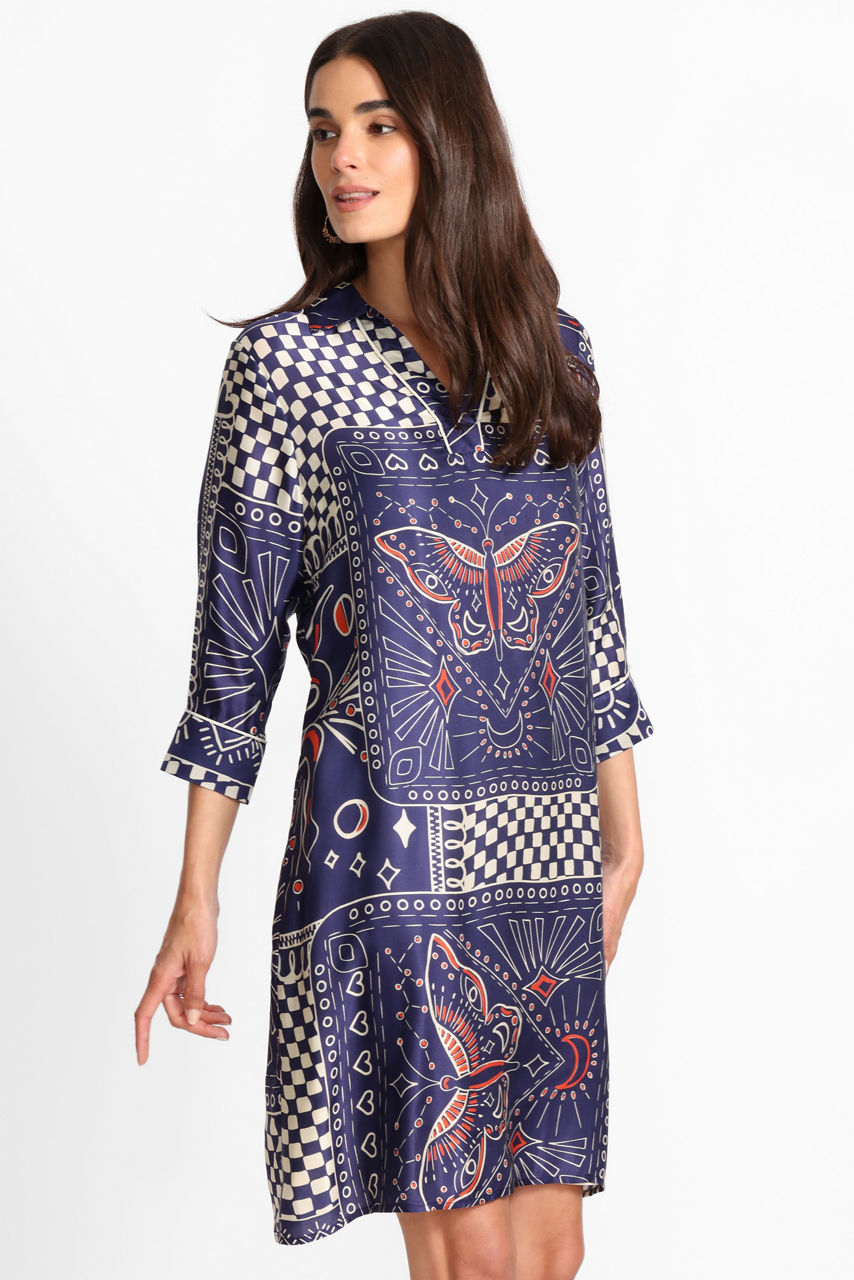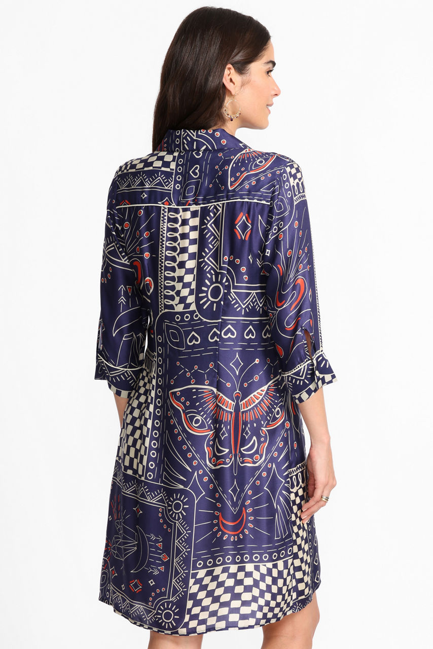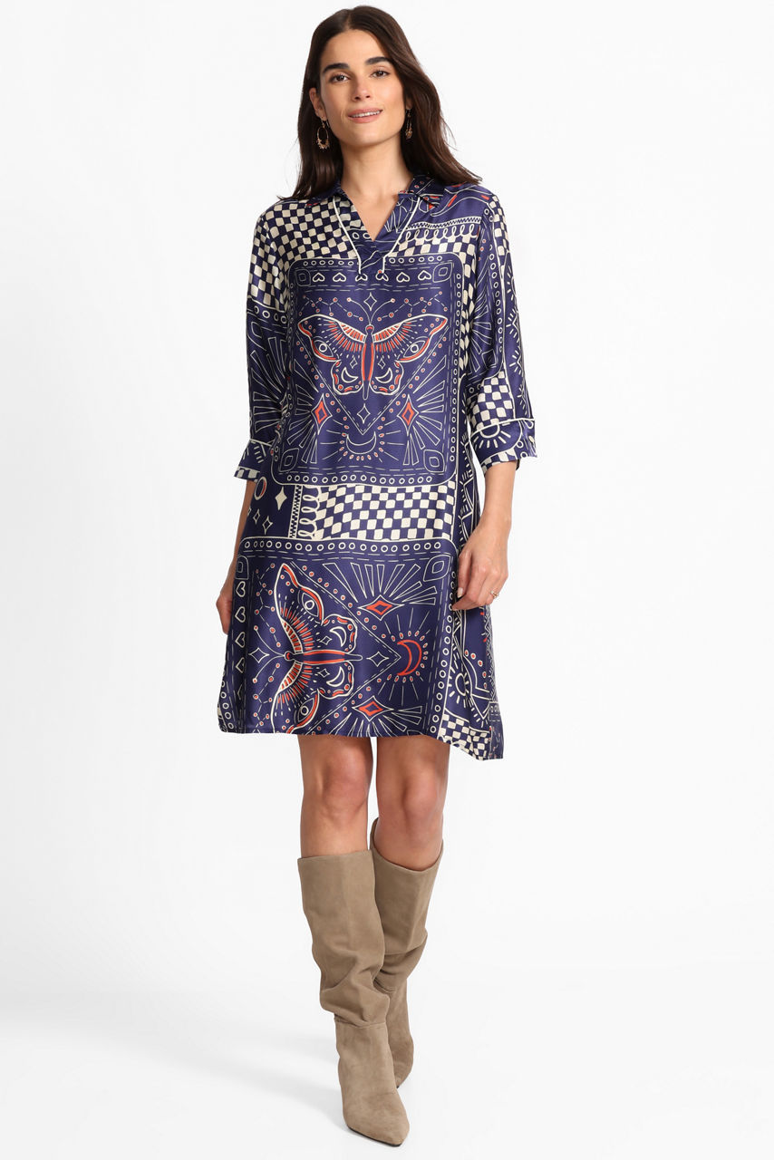 Crafted from a unique silk blend, the Henley Dress is embellished with a vibrant patchwork pattern enriched with bold color. Featuring a Henley neckline and 3/4 sleeves, this slip-lined dress is finished with a back yoke. Pair with western-style boots and a metal belt for a modern casual look.