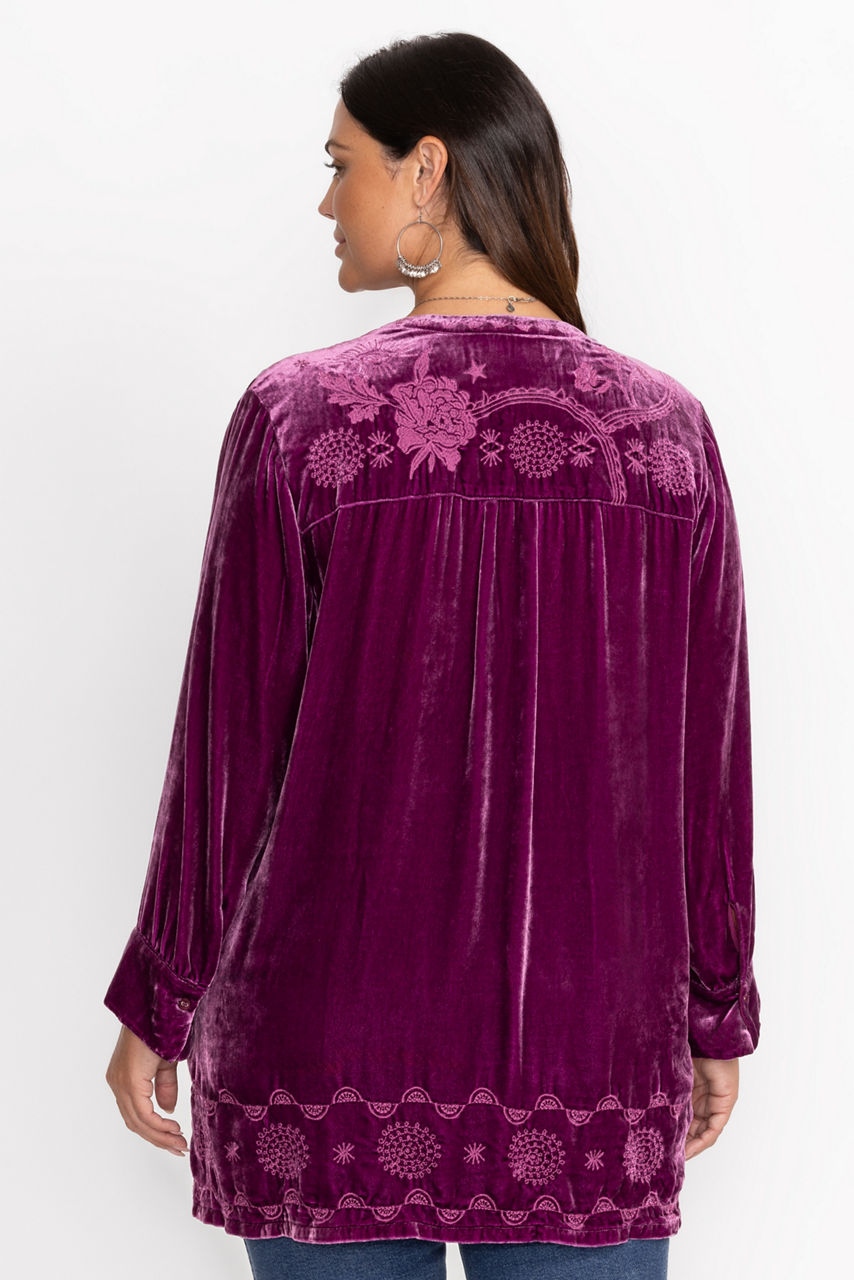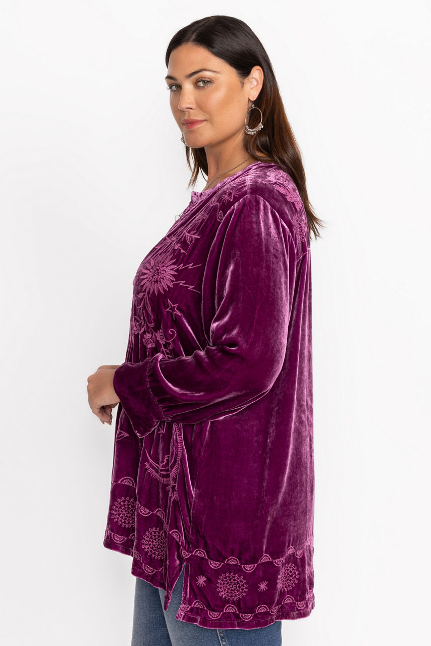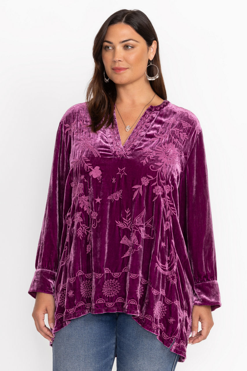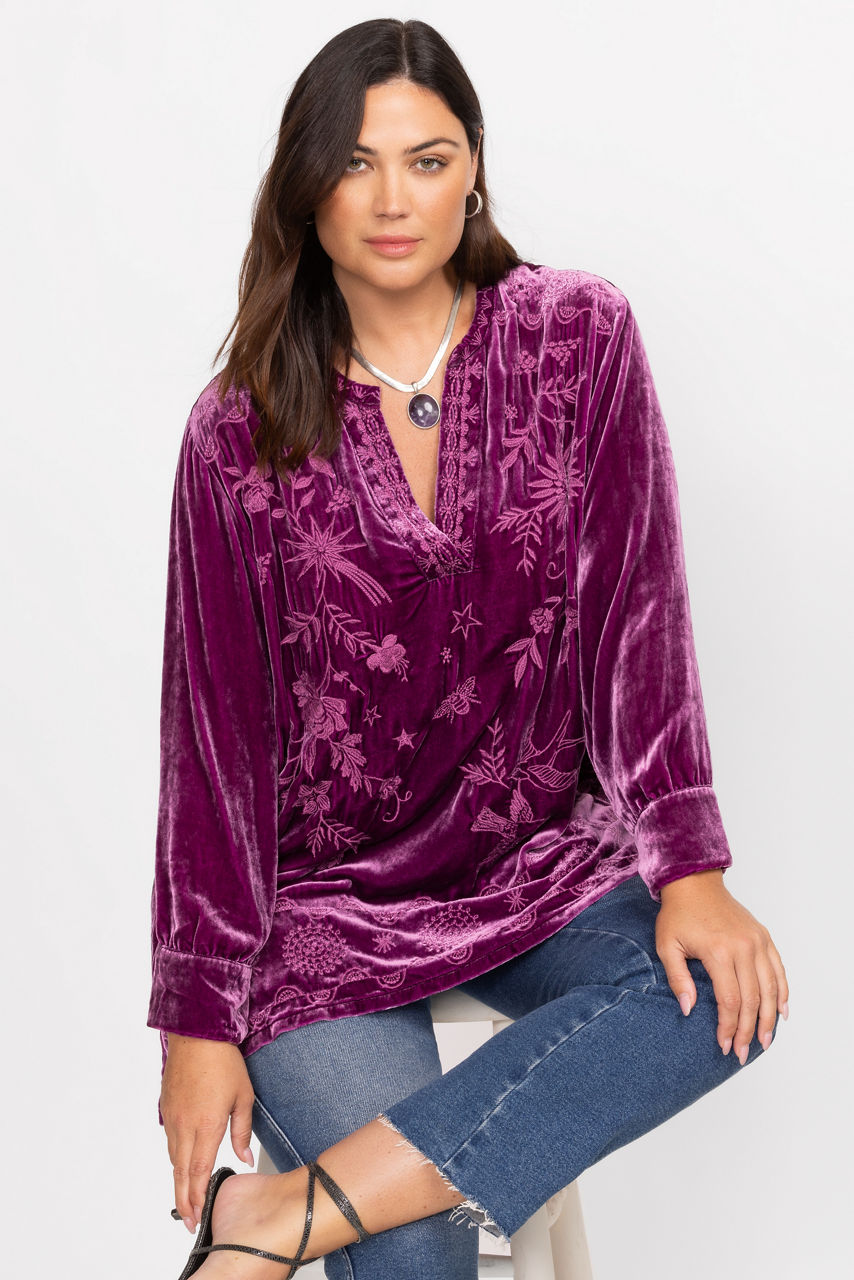 Crafted from a unique silk blend, the Torine Henley Voyager Tunic is embellished with intricate placement embroidery. Featuring a split V Henley neckline and gently puffed sleeves, this relaxed-fit tunic is finished with a flowing waterfall hemline. Layer over fitted leggings and pair with ballet flats for a polished casual look.