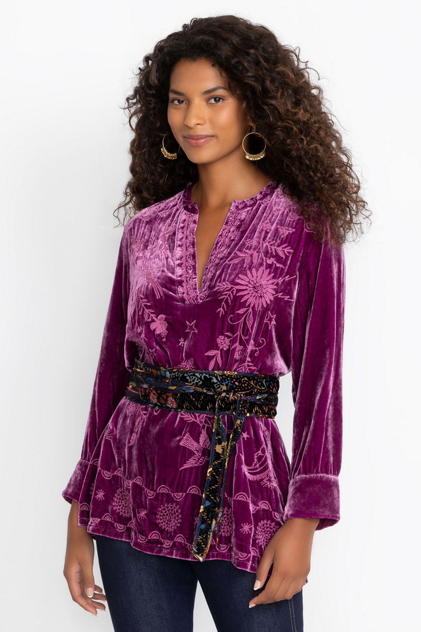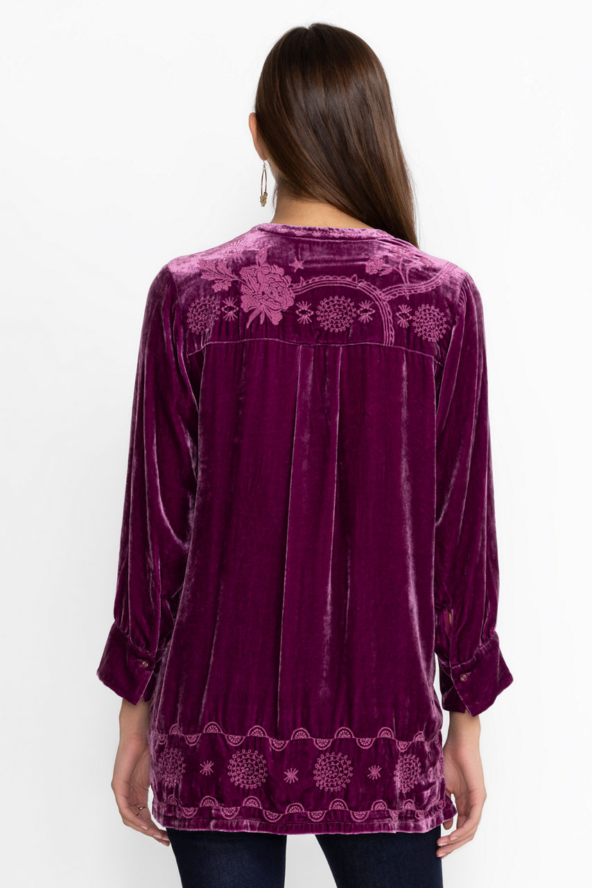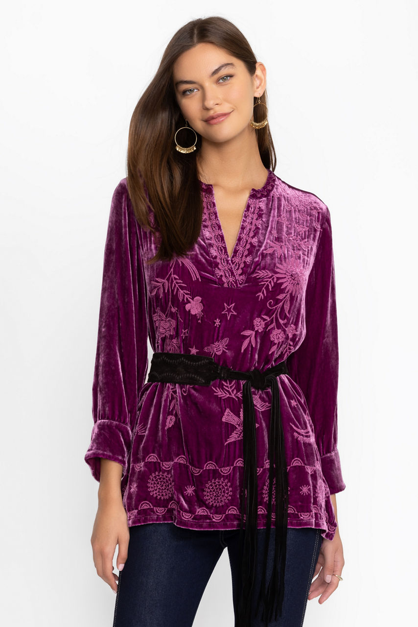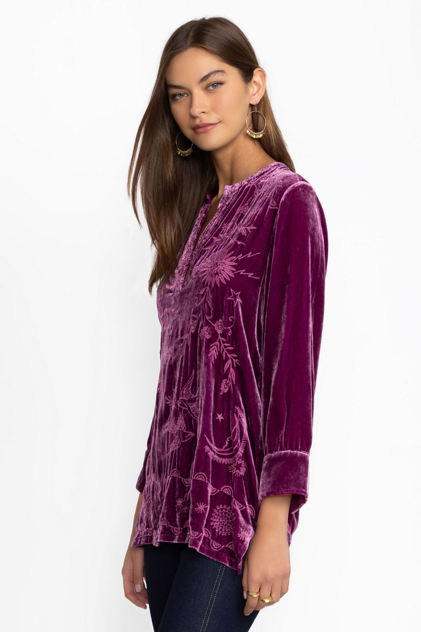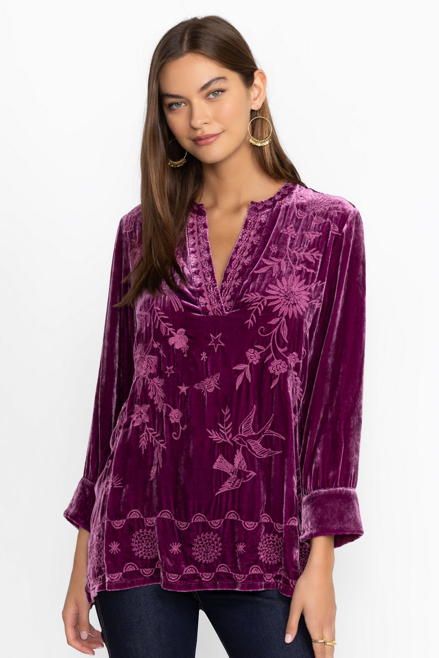 Crafted from a unique silk blend, the Torine Henley Voyager Tunic is embellished with intricate placement embroidery. Featuring a split V Henley neckline and gently puffed sleeves, this relaxed-fit tunic is finished with a flowing waterfall hemline. Layer over fitted leggings and pair with ballet flats for a polished casual look.