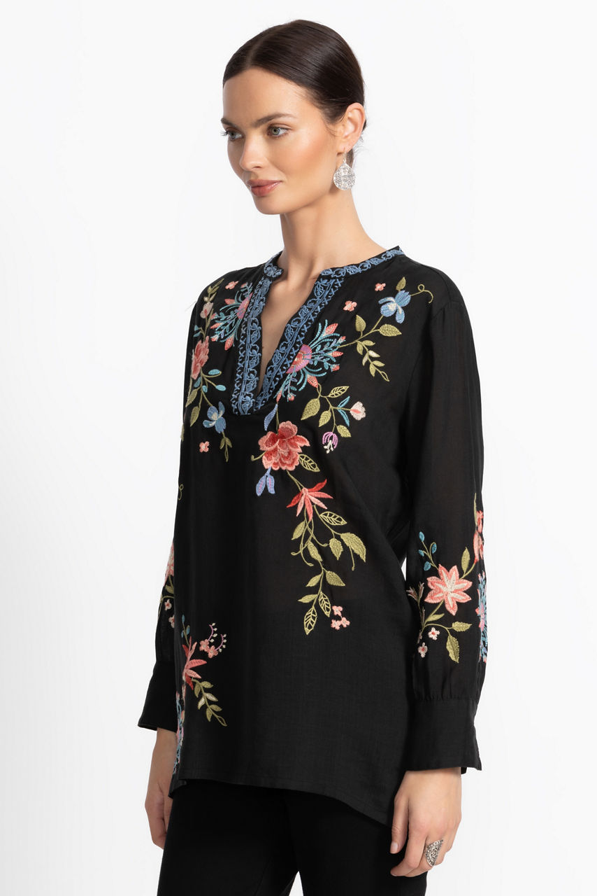 Thoughtfully adorned with vibrant embroidered detailing, the Henley Voyager Tunic is crafted from a lightweight flowing fabric. Designed with a classic Henley neckline and 3/4 sleeves, this elegant tunic top is finished with an embroidered yoke at the back and a stunning handkerchief hemline. Pair with fitted leggings and modern flats for an elevated casual ensemble.