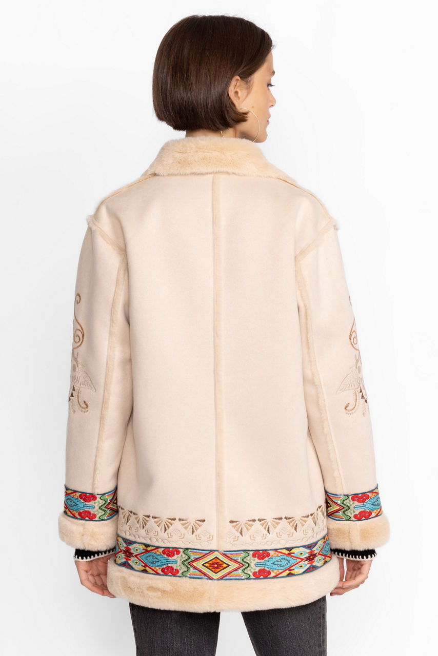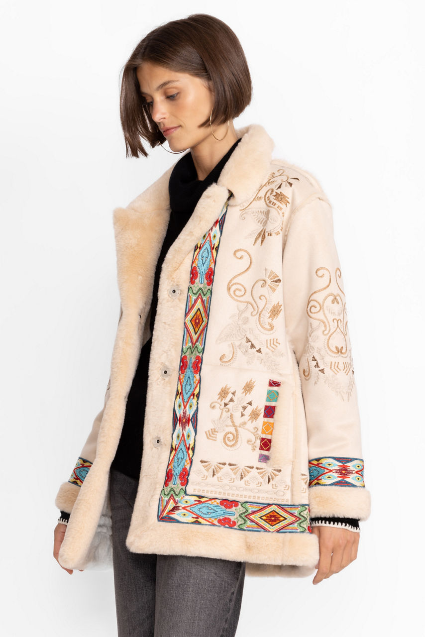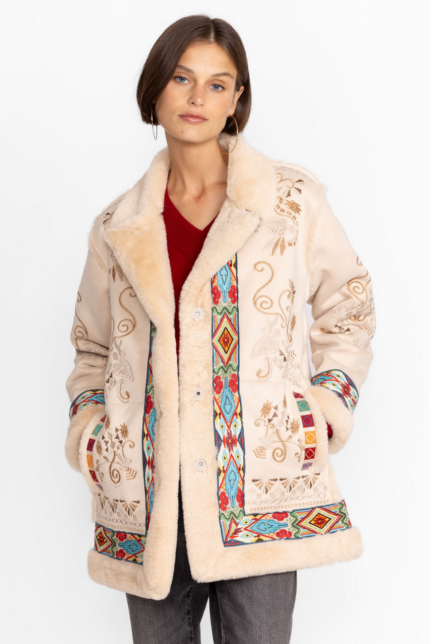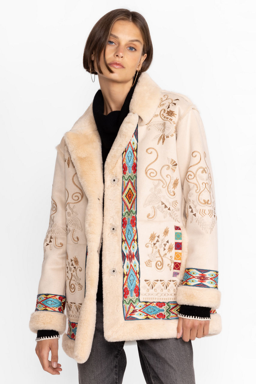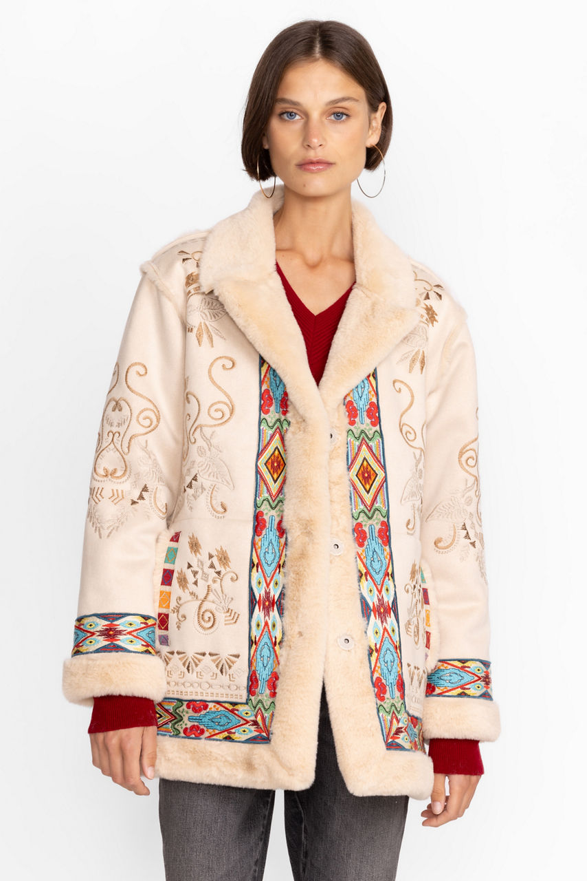 Add a touch of unmatched style to apres ski activities with the Hepburn Ski Faux Fur Coat. Perfect for both the slopes and evening activities, this coat is made from insulating faux fur and features a fabric covered snap closure, pockets, a faux fur collar and trim, and a detailed floral placement embroidery. Pair with knitted pants and a sweater for a cozy cold-weather finish.