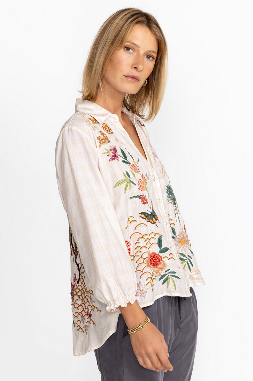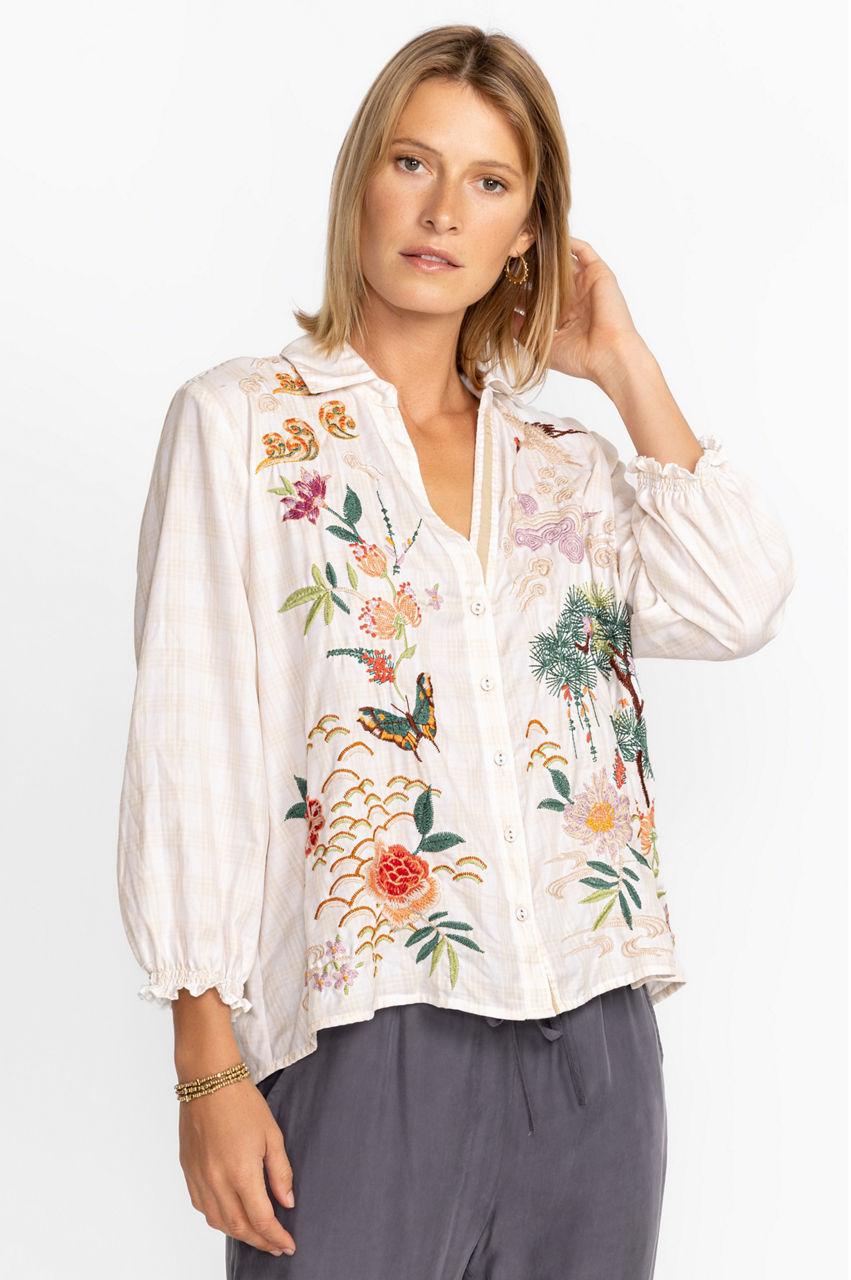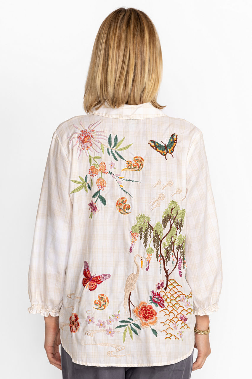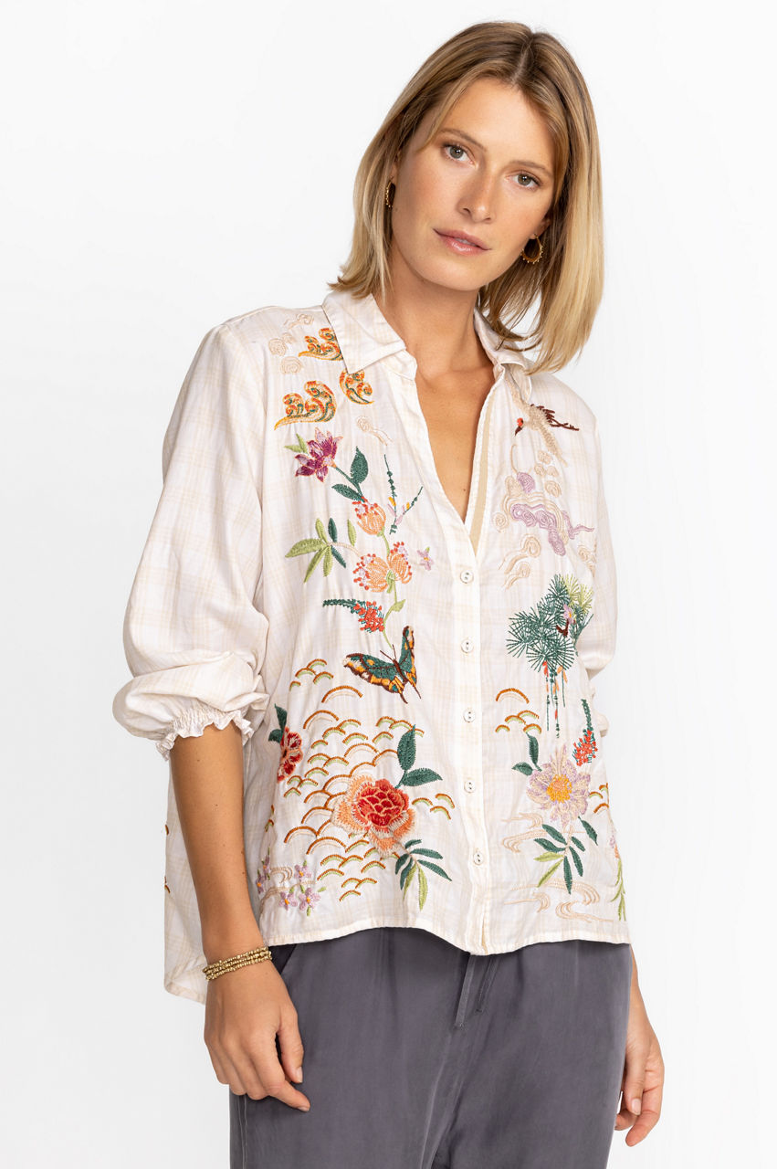Featuring inspiring scenes from nature that seem to come to life as you move, the Heron Relaxed Smocked Shirt is a truly unique addition to your wardrobe. Offering a relaxed silhouette and masterfully crafted placement embroidery, this blouse is a versatile piece that can easily be worn on its own or as a layering piece. Pair with your favorite jeans and crisp white sneakers for a casual vibe.