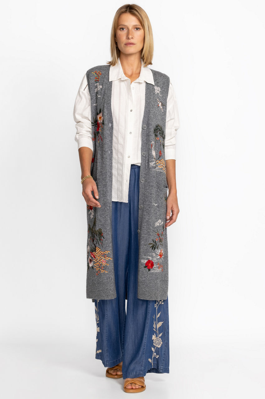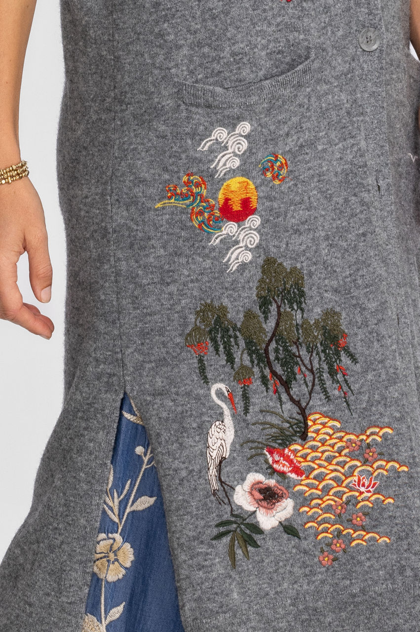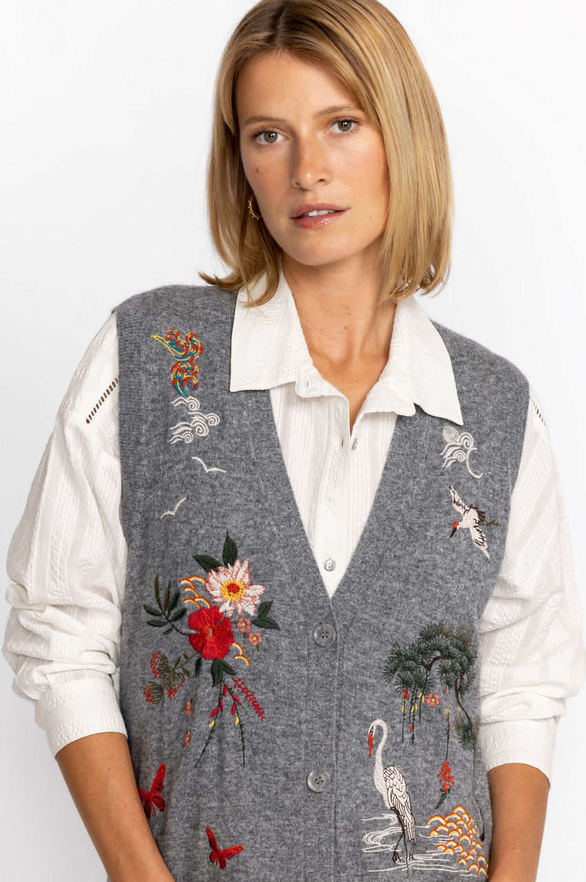 Envelope yourself in elegance with the midi length Heron Vest. Thoughtfully embellished with placement embroidery and well-crafted from a satisfying wool and cashmere blend, this vest is a wardrobe statement piece and a versatile look for any occasion. Layer over a silk blouse and denim trousers for a polished daytime look.