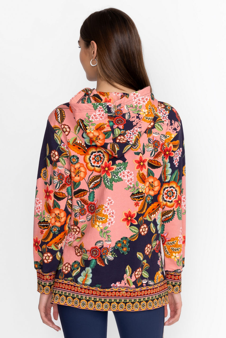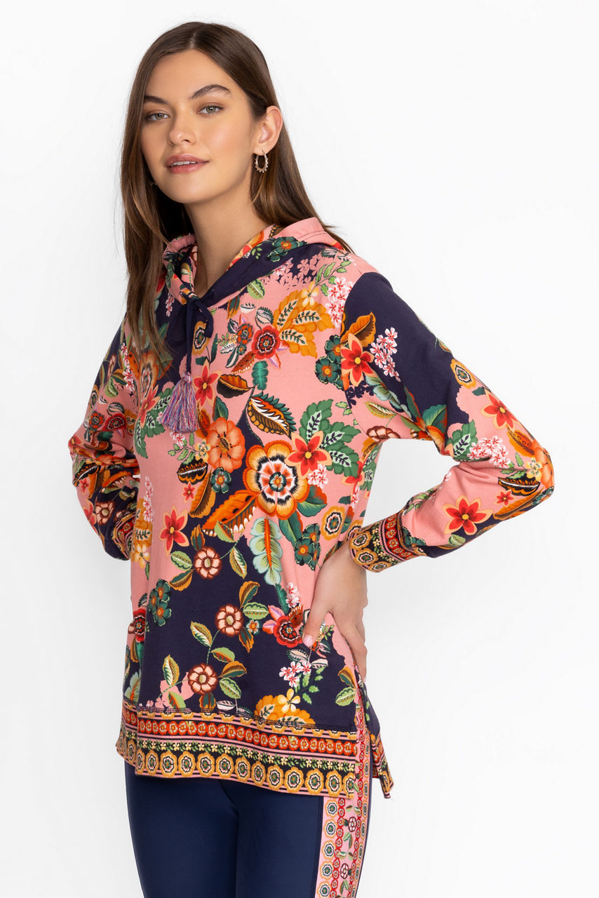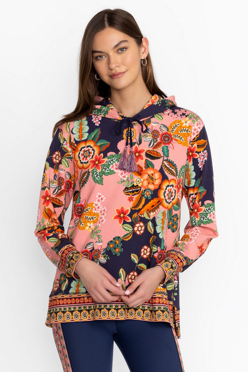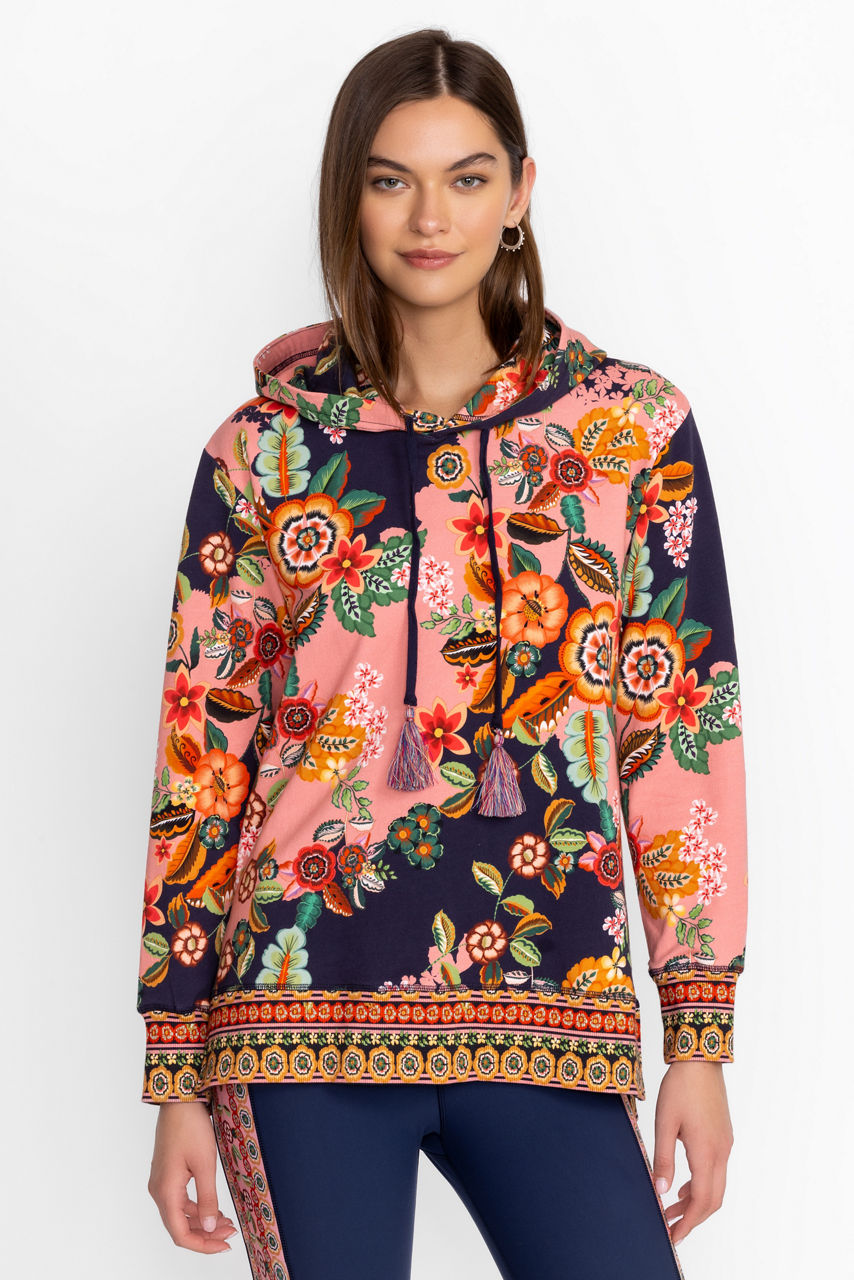 Adorned with brilliant floral blooms, the High Low Pullover Hoodie is crafted from a rich cotton blend with a hint of stretch. Featuring a hood with drawstring tassels, this cozy pullover offers side slits and ornate contrasting ribbing at the sleeves and hemline. Pair with coordinating joggers and fashion sneakers for a casual athleisure vibe.