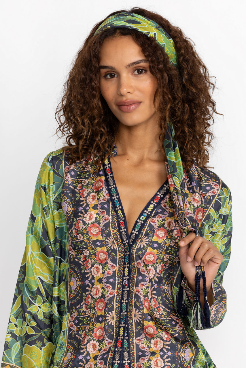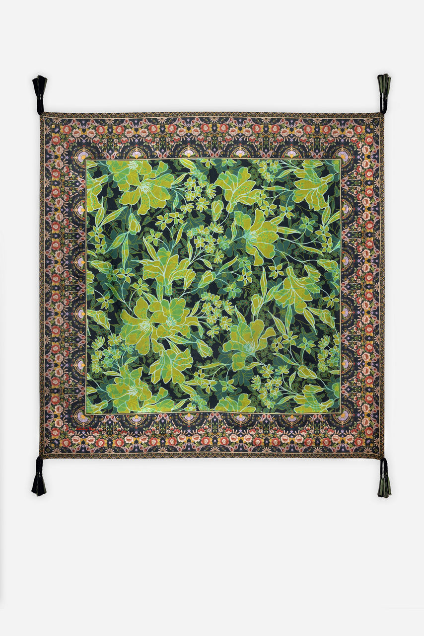 Spun from sumptuous silk, the Hirz Scarf transforms a classic accessory into a new season statement piece. Imagined in a green color scheme, this scarf is enhanced by an eye-catching print, a contrast border, and tassels at the corners. Style this scarf with a midi dress for a timeless feminine look.