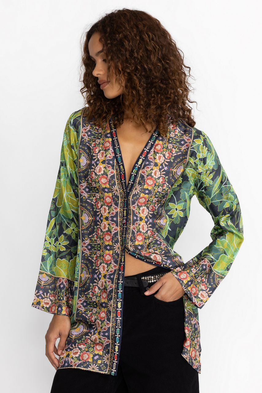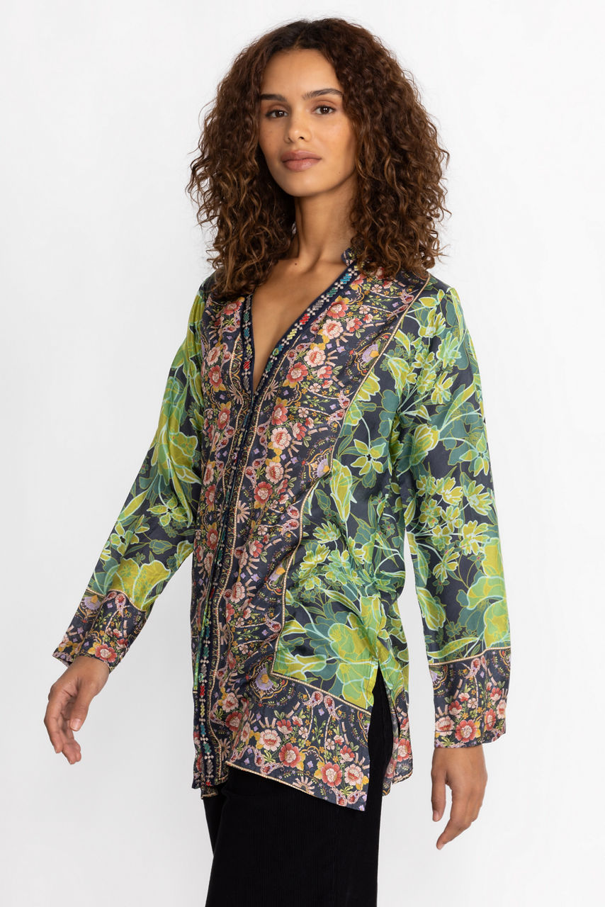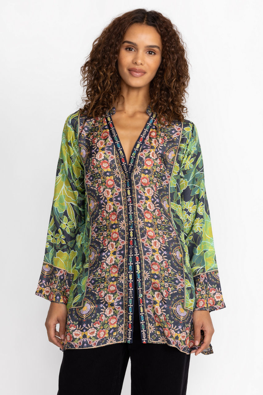 Spun from sumptuous silk, the Hirz Tali Tunic is the height of elegant grandeur. A timeless statement piece, this green patterned tunic features a collar, long sleeves, fabric covered buttons, and a striking print along the placket and edges. Style this tunic over a simple slip dress for an elegant take on evening dressing.
