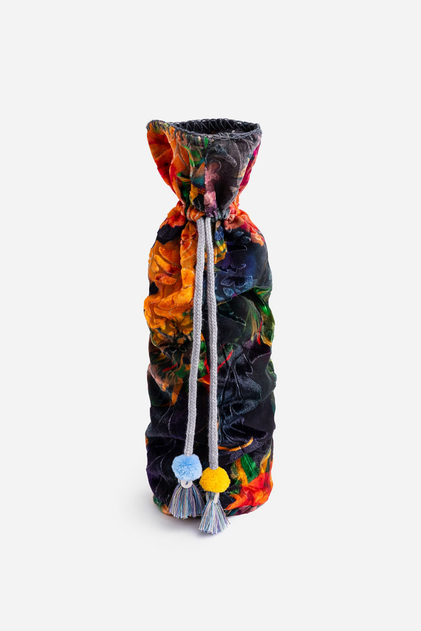 Embellished with an intricate designs, the our Holiday Wine Tote serves to elevate the spirit of the season. Crafted from a rich fabric, this elegant tote features a drawstring closure accented by colorful pom poms. Wrap a bottle inside to present as a hostess gift at seasonal events.