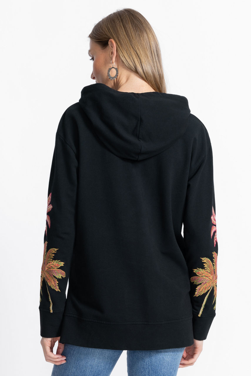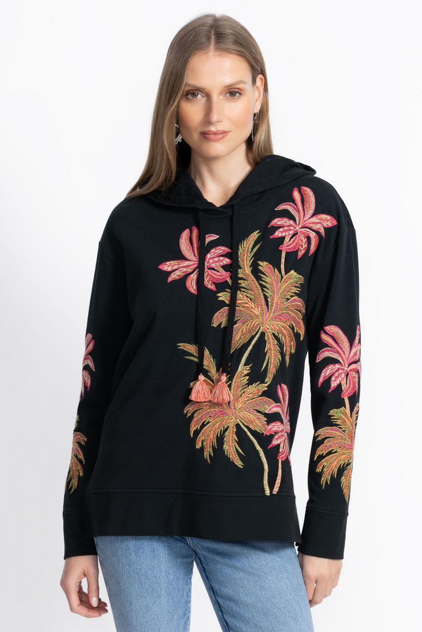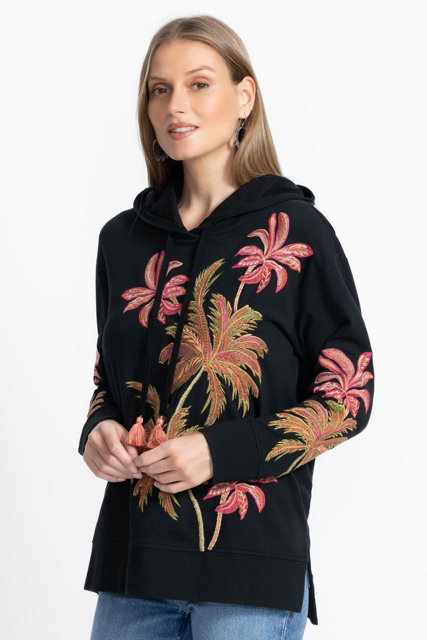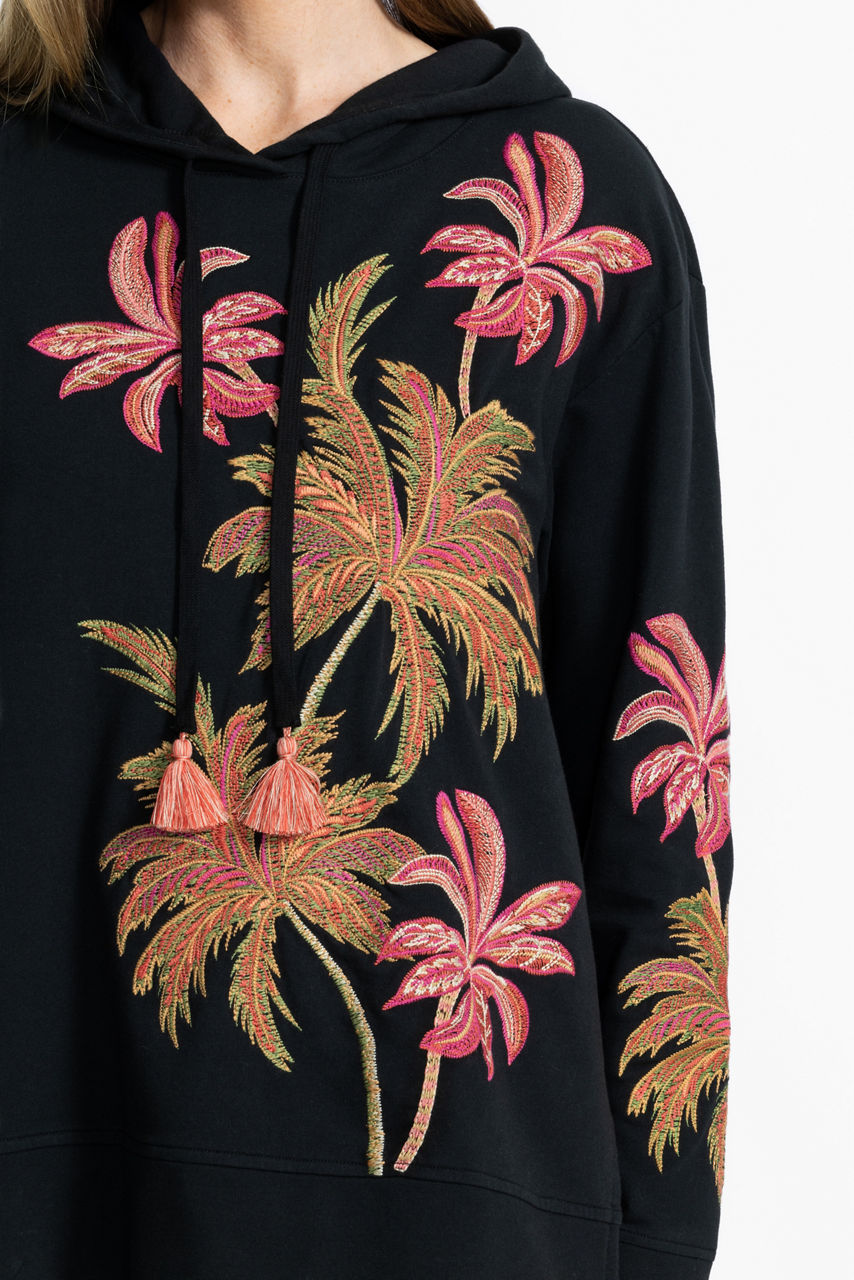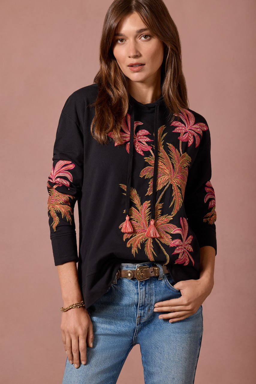 Crafted from a rich cotton blend with a hint of stretch, the California Hooded Tunic Sweatshirt is embellished with iconic palm trees intricately embroidered in rich, warm colors. Featuring an attached hood with a drawstring and tassels, this cozy pullover is finished with side slits for a relaxed fit. Pair with classic black leggings and fashion sneakers for a comfortable weekend look.
