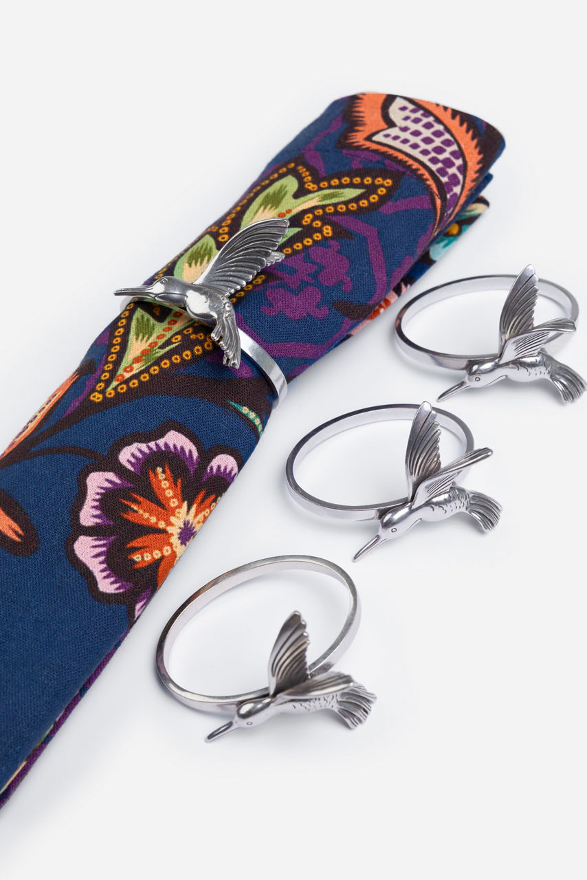 Crafted from 100% silver-tone brass, the Hummingbird Napkin Ring Set adds a touch of whimsy to your dining room. Featuring a traditional napkin ring embellished with intricately detailed hummingbird silhouettes, this unique set of four napkin rings adds the perfect finishing touch to your table setting. Pair with the Comono Paisley napkins and tablecloth for an elegant finished look.