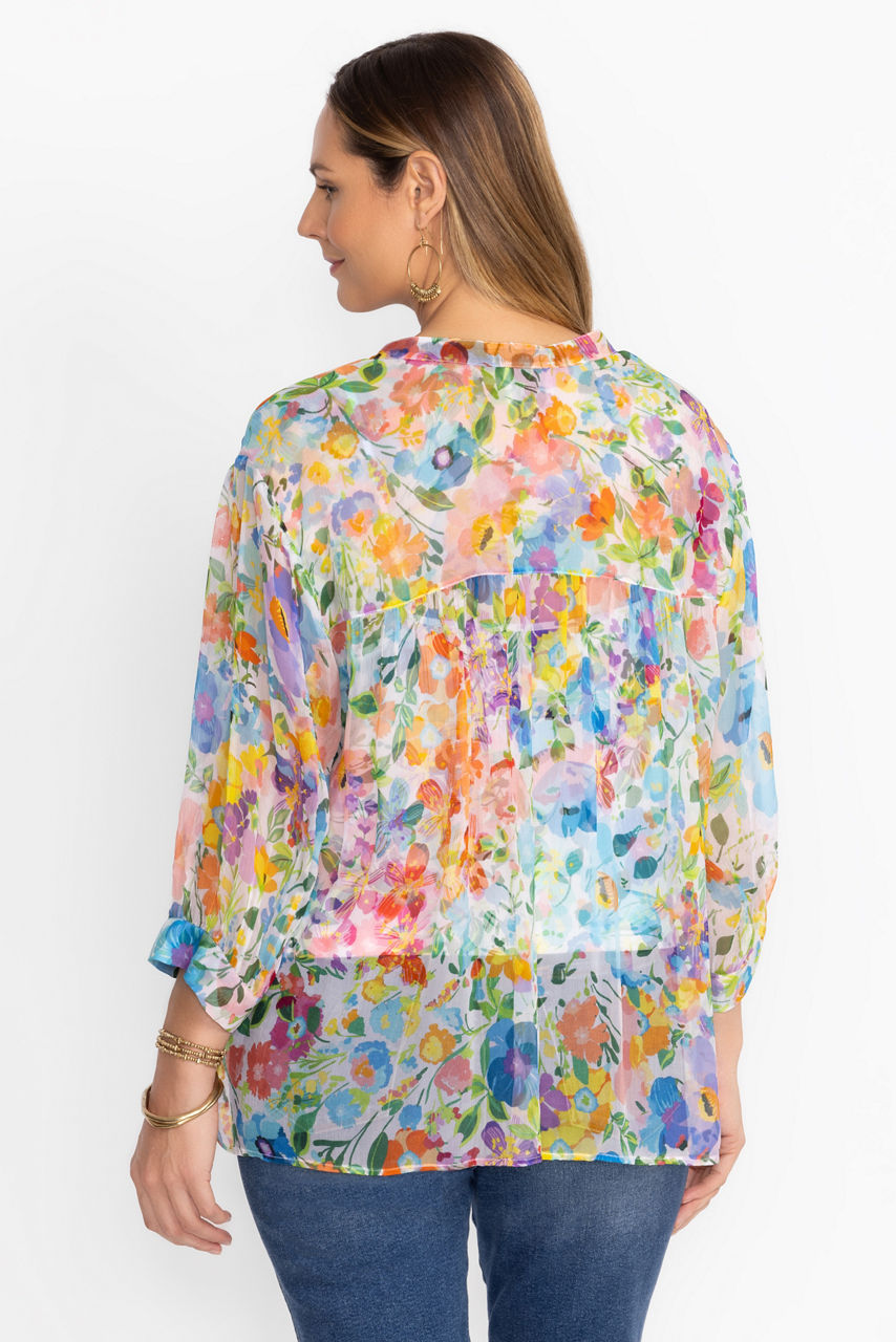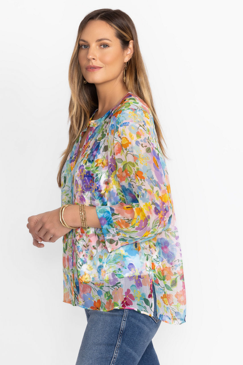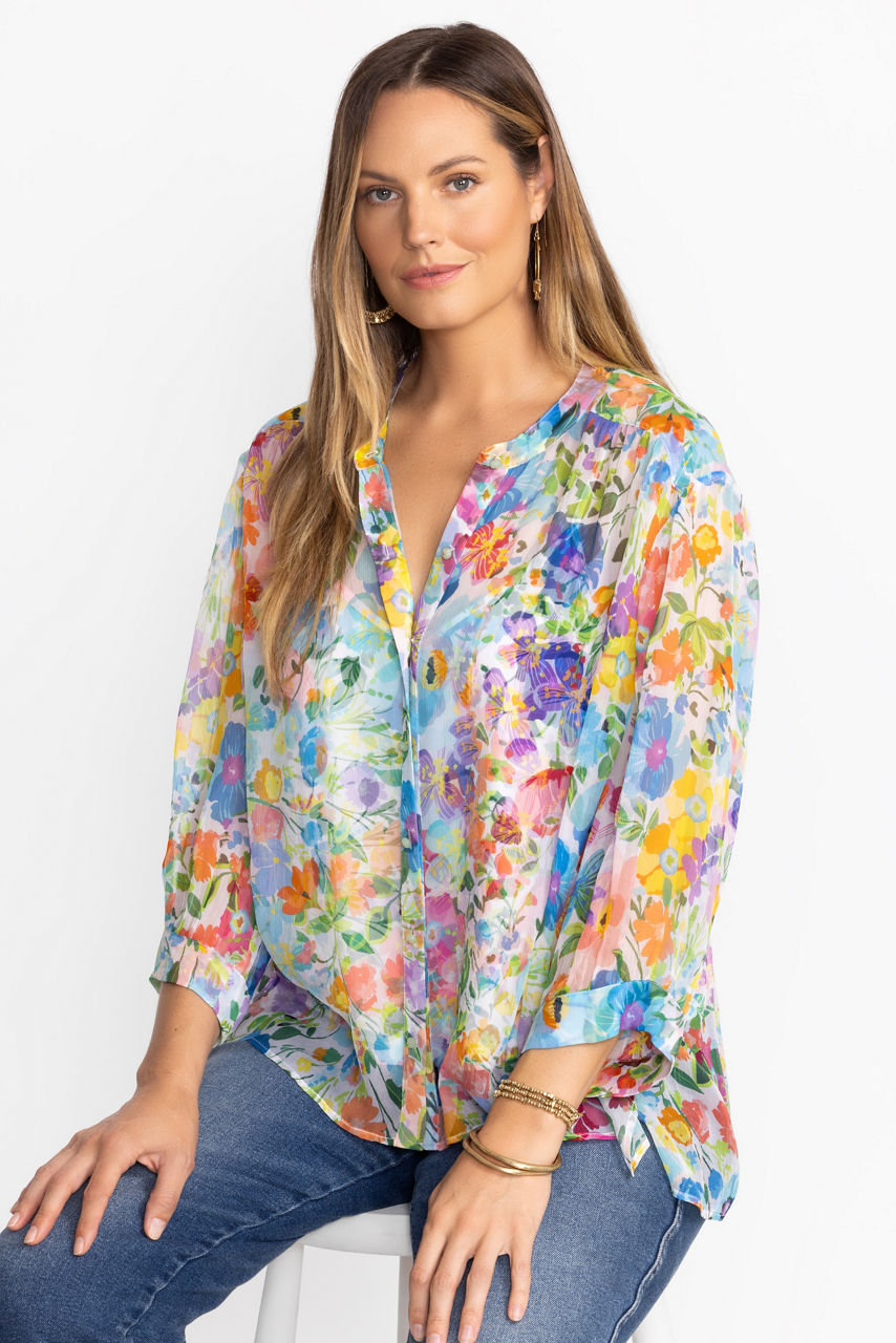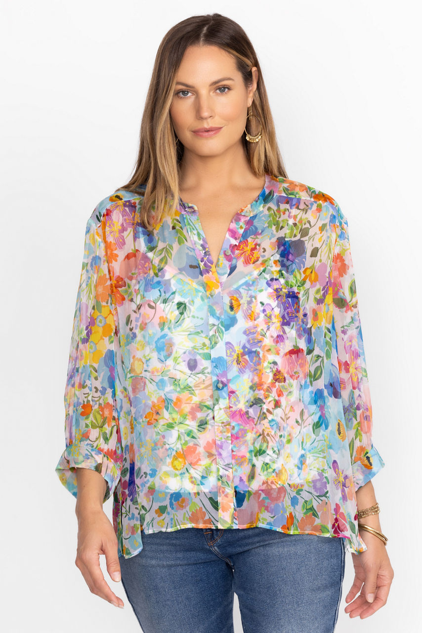 Crafted from 100% flowing silk, the Hunni Blouse is embellished with bold color and floral bouquets. Featuring a rounded neckline with a button-front, this vibrant cami-lined blouse offers shirring at the shoulders and cuffs adding texture to the overall look. Pair with dark wash denim and smart flats for a captivating weekend look.