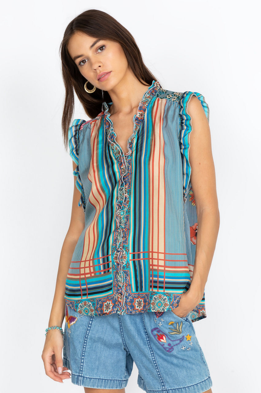 A versatile top with charming, ruffled sleeves, our Hunter Ophelia Blouse is great for any occasion, from sightseeing in a new city to dining with friends at a rooftop restaurant. Silky smooth and a button front add a touch of classic elegance to this top. Pair with dark denim and strappy heels. For cooler nights, layer with a trendy leather jacket.
