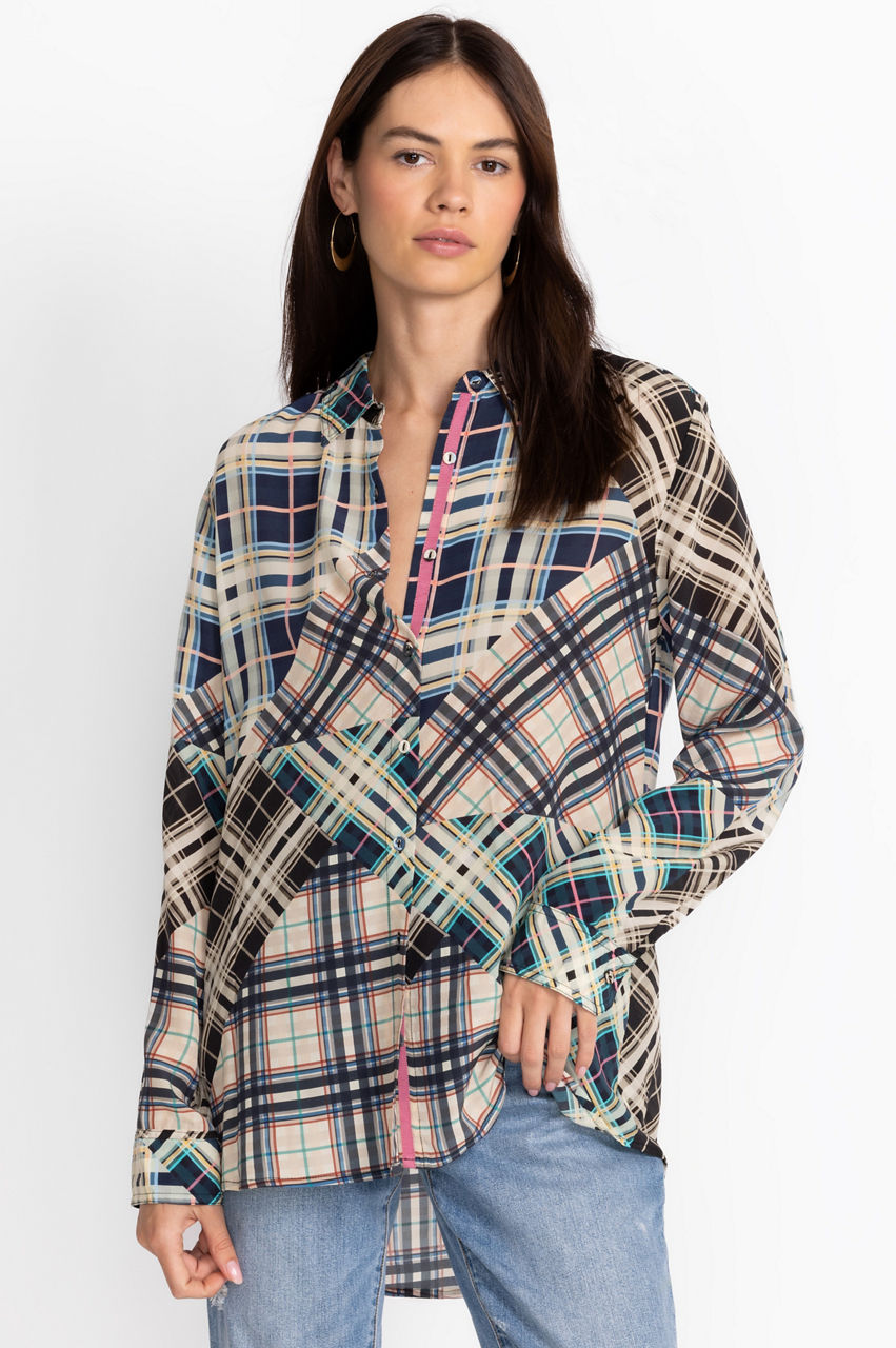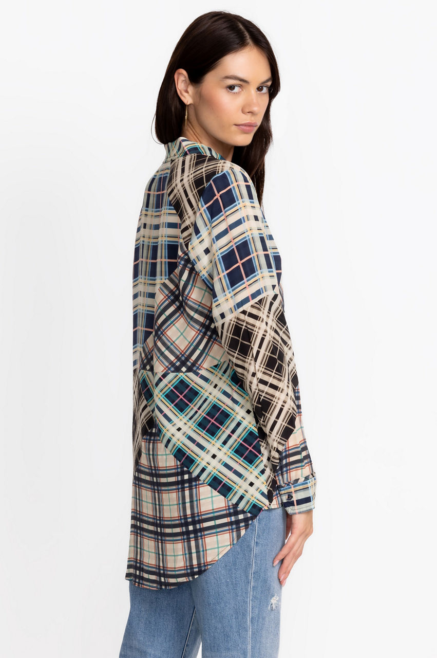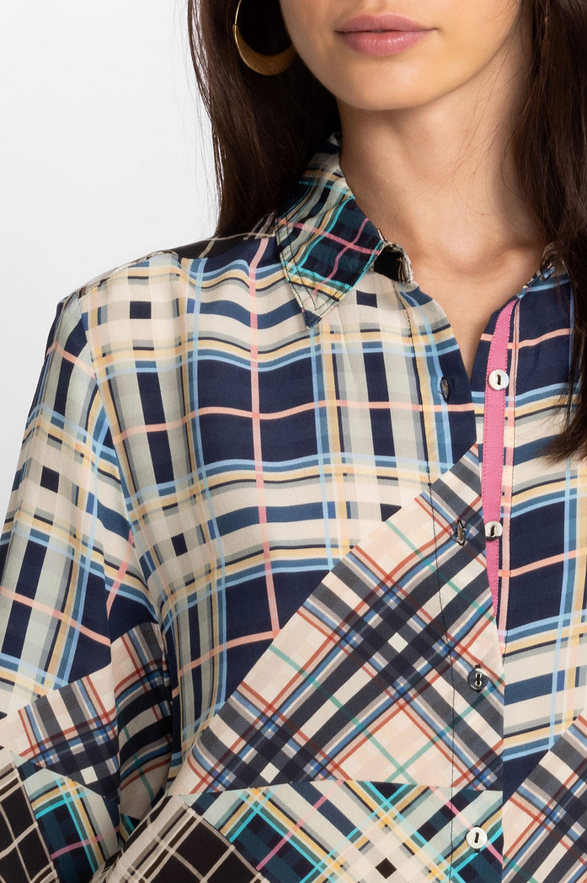 Offering a fresh take on traditional plaid, the Idora Patchwork Button Down Shirt is a delight for the senses. Crafted from sumptuous 100% silk and purposefully designed with visual variety, this button-front blouse elevates a classic print to new heights. Pair with denim trousers and wedge ankle boots for a night out with friends.