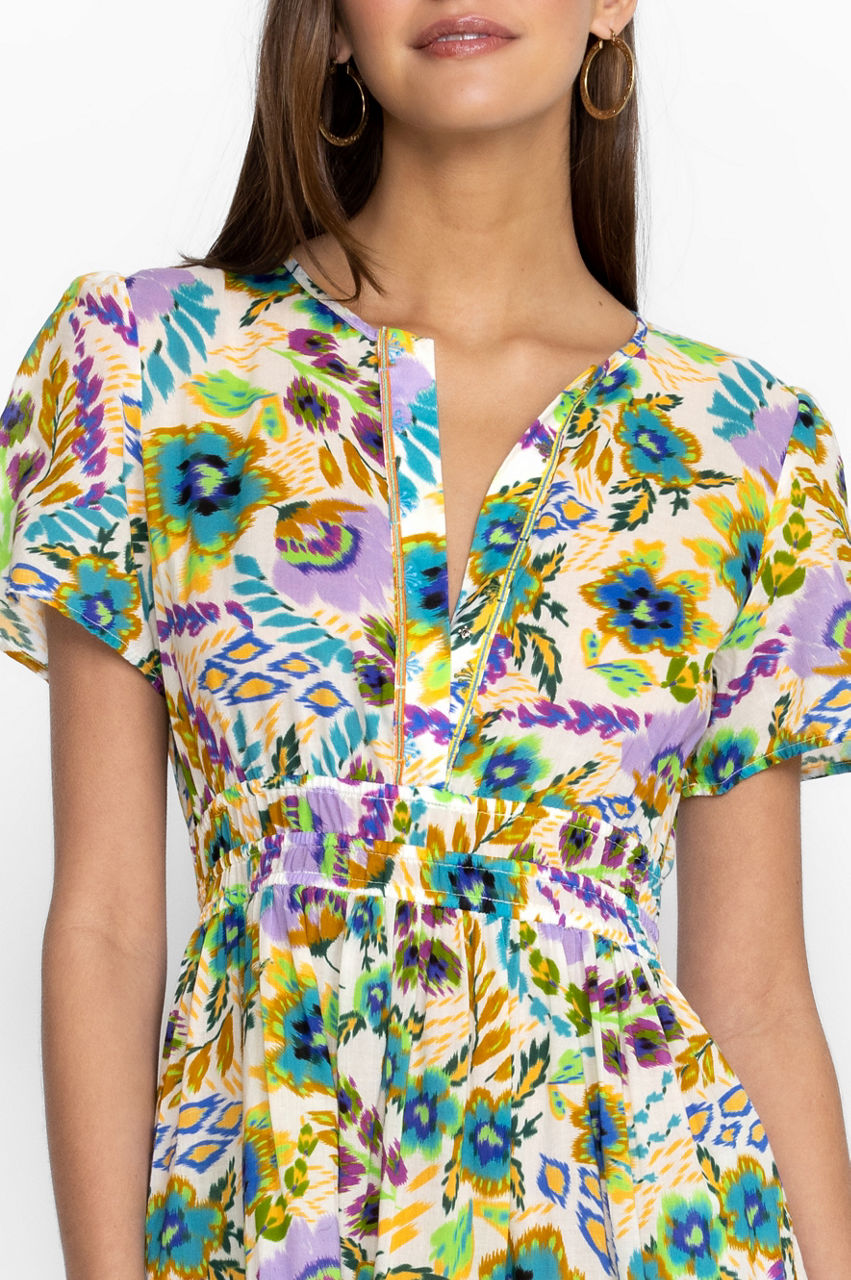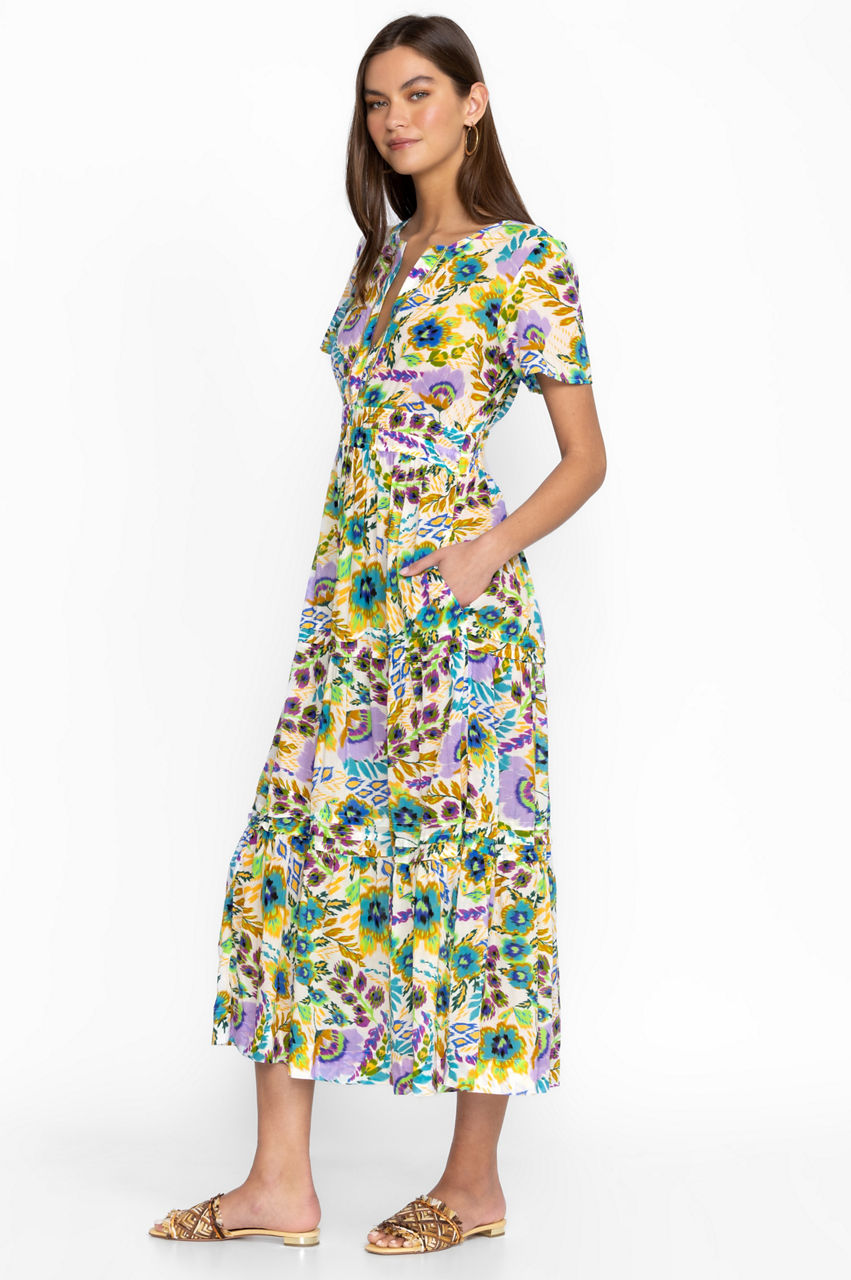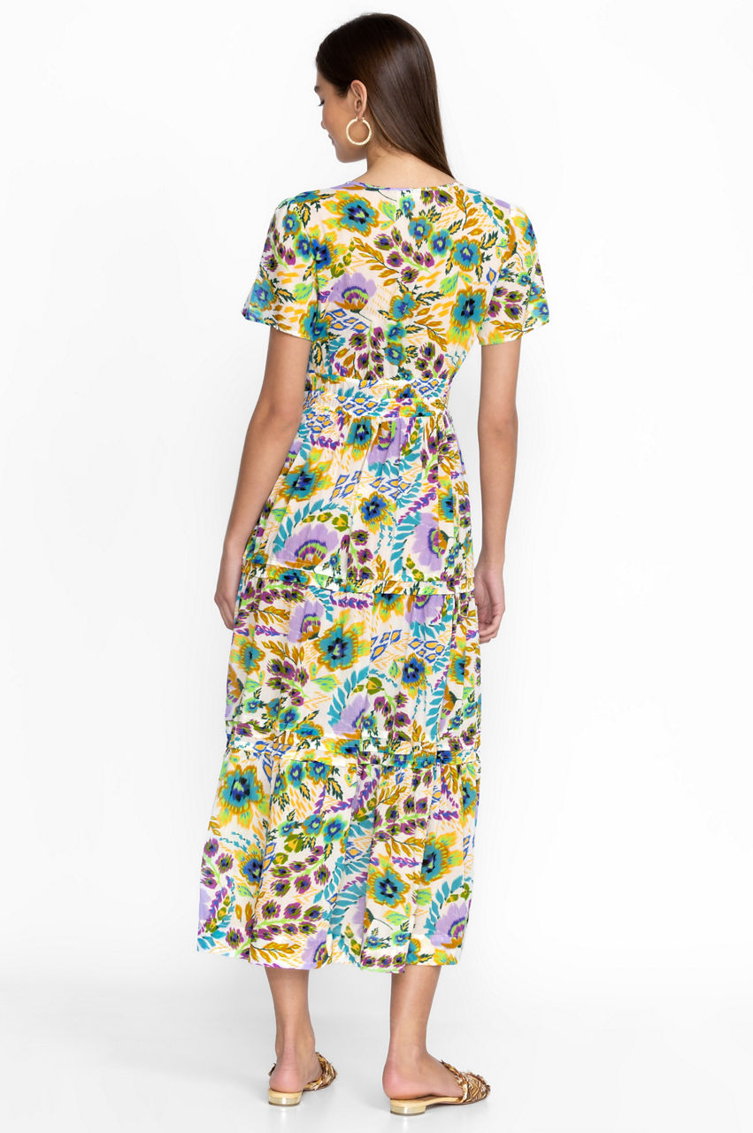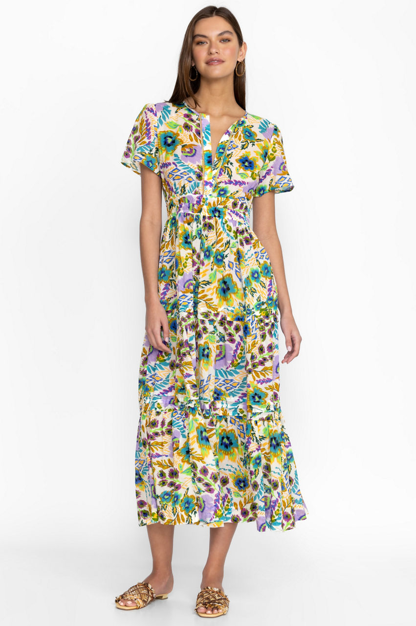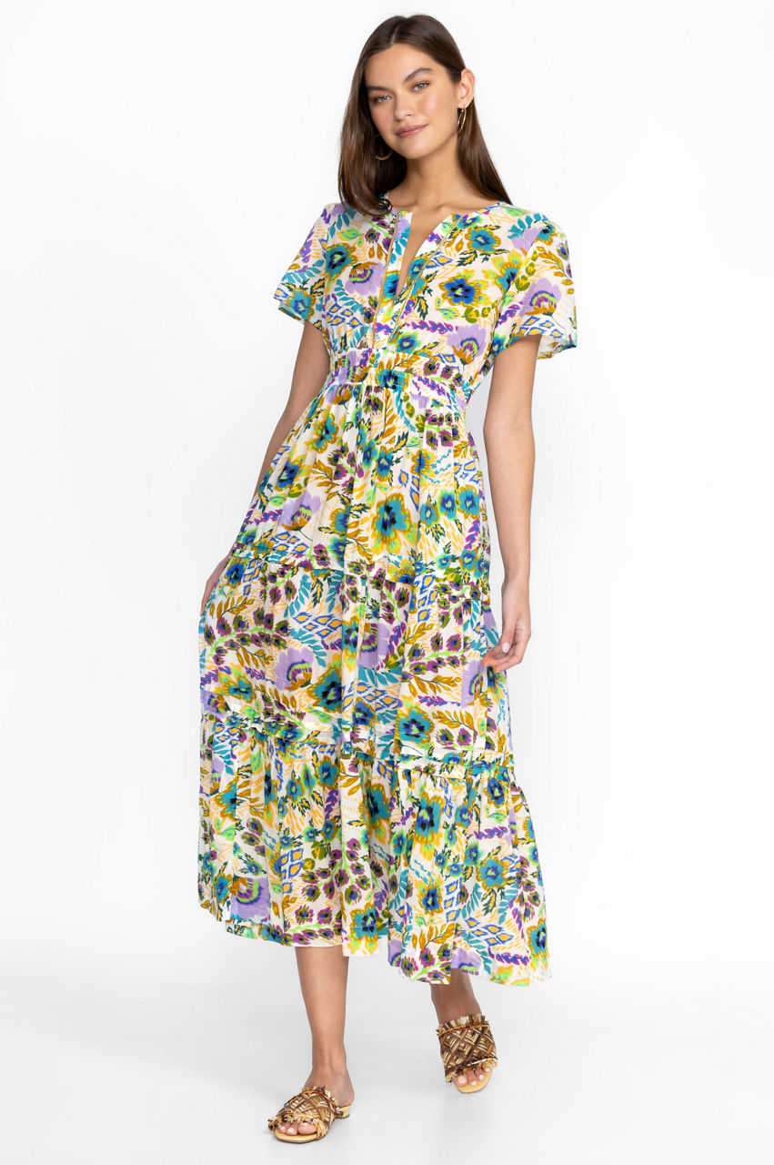 Displaying beautiful blooms on a field of 100% cotton fabric, the Ikat Bloom Pintuck Tiered Dress is art in motion. A delicate tiered skirt punctuated by a fitted elastic waist creates a classic silhouette with an air of femininity. Pair this dress with pointed flats and delicate jewelry for an inspired take on anytime style.