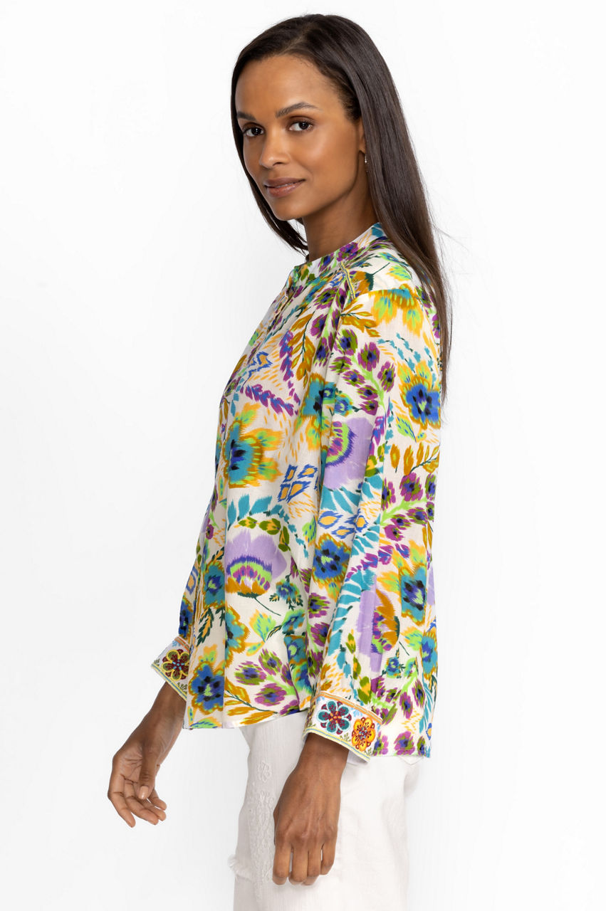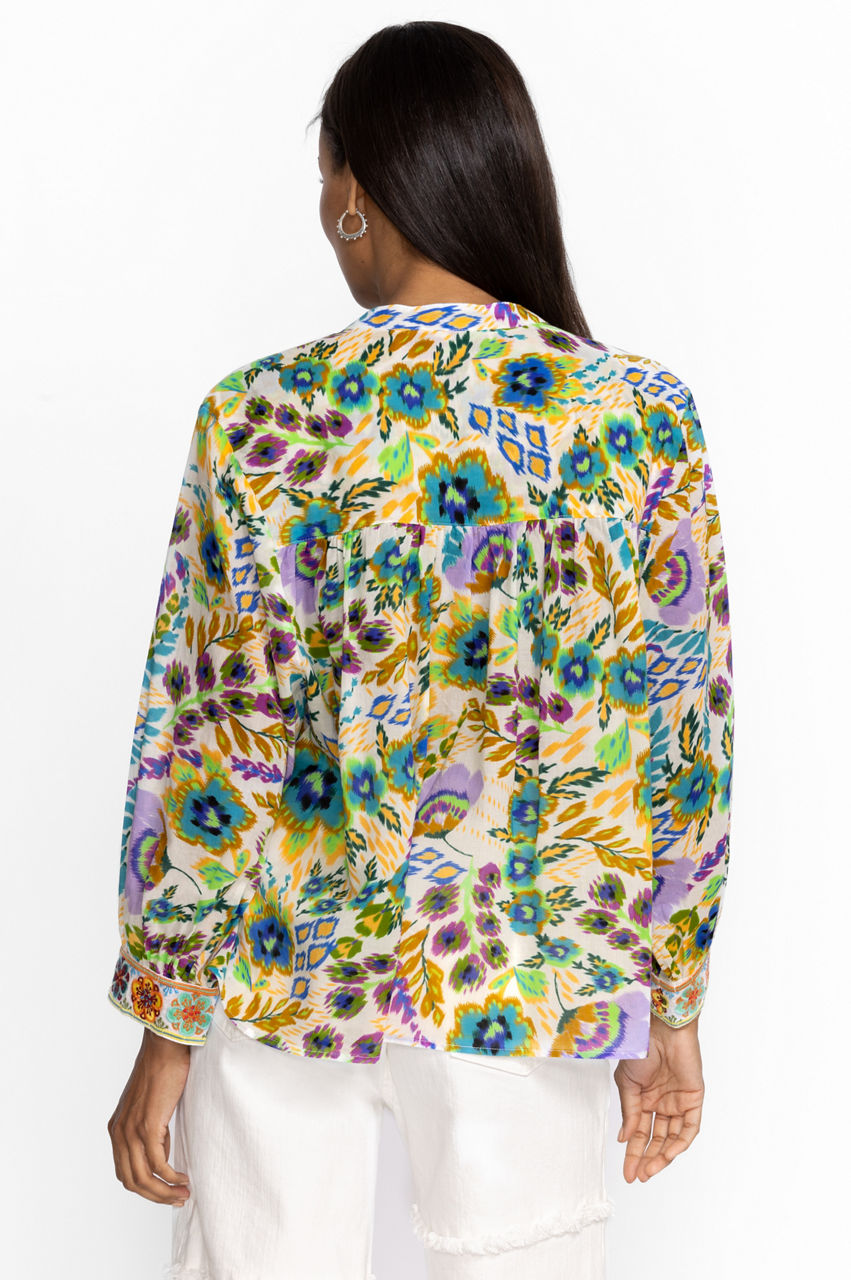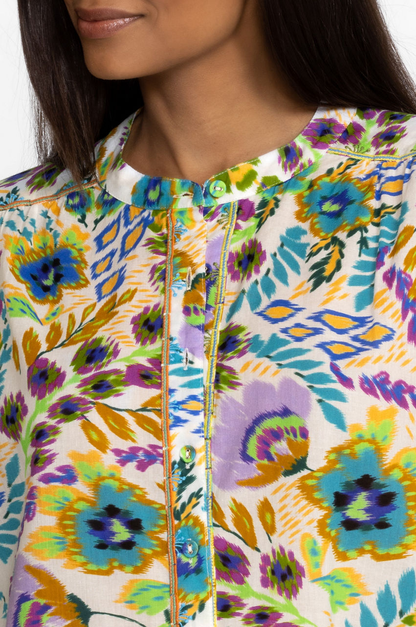 Reminiscent of a spring garden in bloom, the Ikat Bloom Shirred Yoke Blouse offers an elevated color story with a delicate balance of innocence and boldness. Created from 100% cotton fabric this lightweight stunning blouse is perfect for the warmest days on your calendar. Pair with linen joggers and sneakers for a relaxed silhouette.