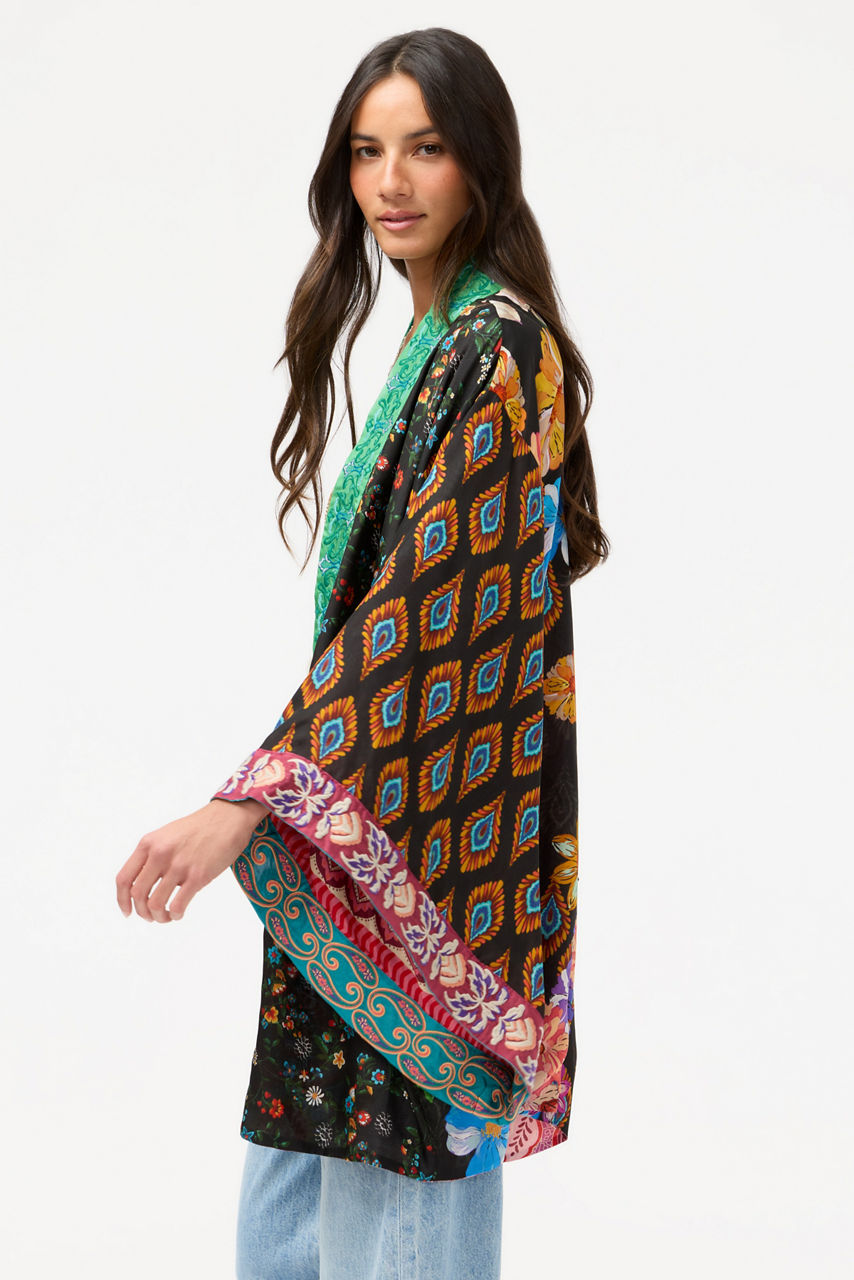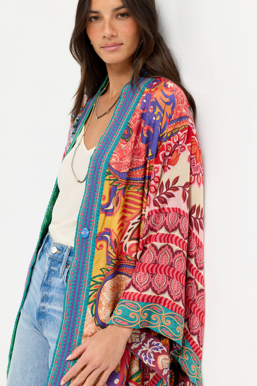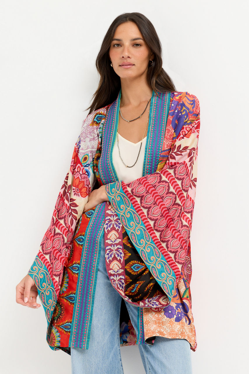 This reversible kimono is beautifully embellished with a patchwork of ornate designs, the Ines Kimono is crafted from 100% flowing silk. Designed with wide kimono sleeves and a contrasting lapel trim, this kimono is finished with fabric covered buttons at the front closure and on-seam pockets. Layer over a monochromatic base layer to allow the kimono to take center stage.