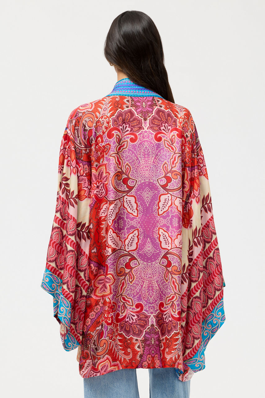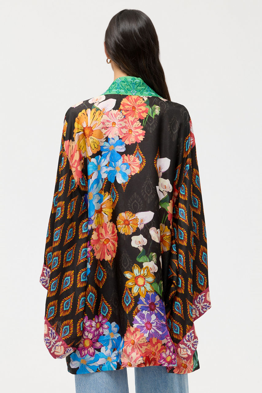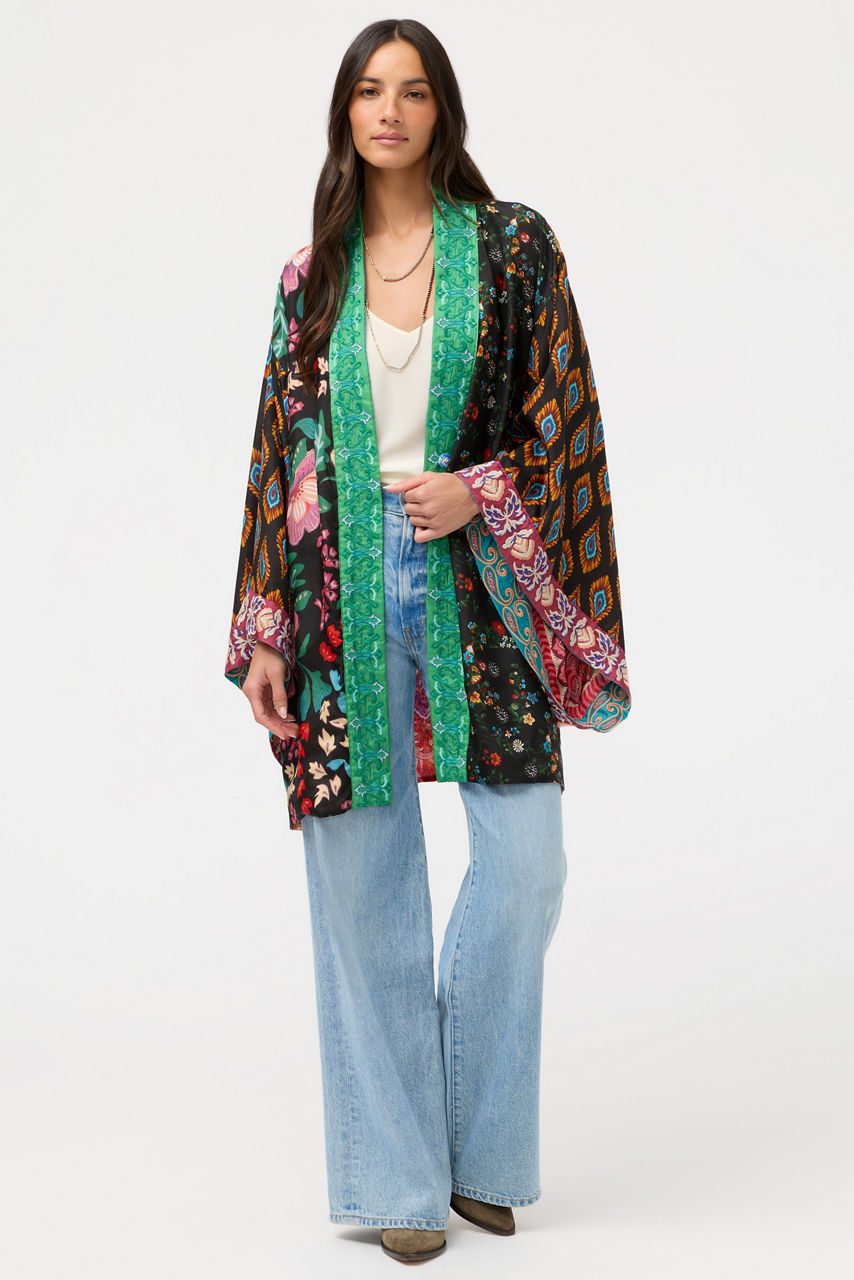 This reversible kimono is beautifully embellished with a patchwork of ornate designs, the Ines Kimono is crafted from 100% flowing silk. Designed with wide kimono sleeves and a contrasting lapel trim, this kimono is finished with fabric covered buttons at the front closure and on-seam pockets. Layer over a monochromatic base layer to allow the kimono to take center stage.