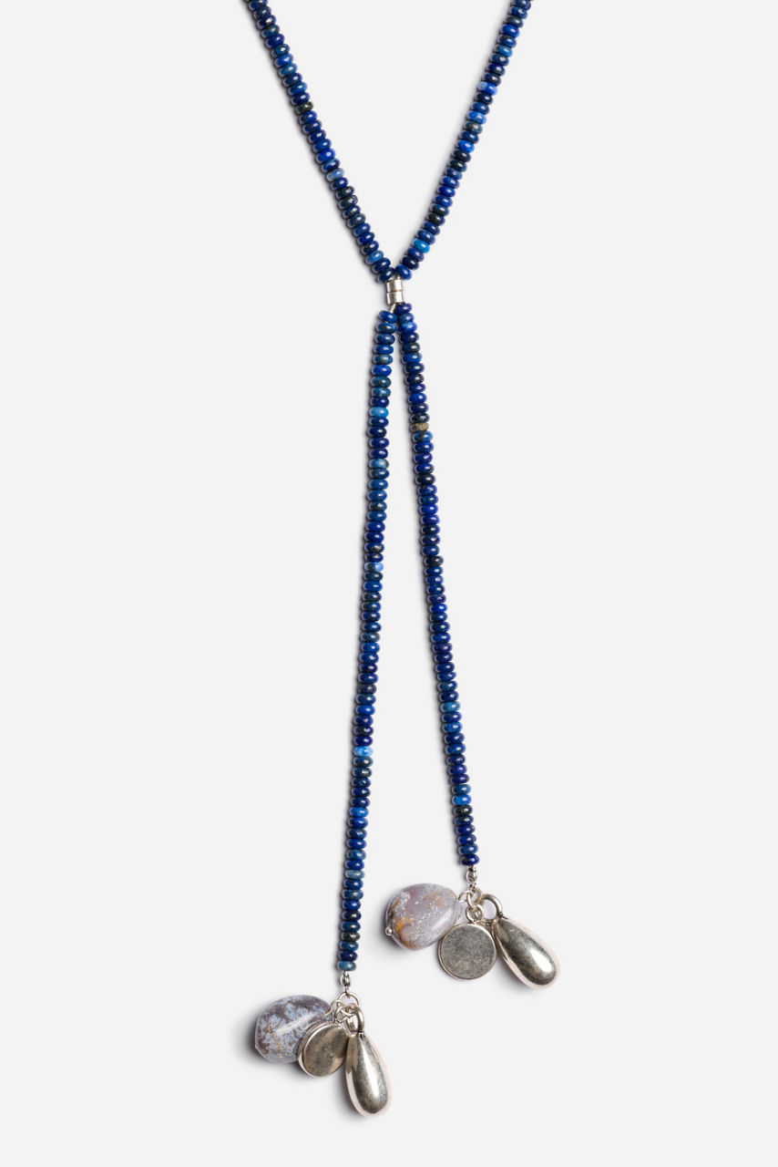 The Infinitely Charm Lapis Bead Necklace is a striking piece crafted with rich blue lapis beads that bring depth and elegance to any look. Its long, versatile strand is accented with silver-toned charms and natural stone pendants, adding a touch of organic beauty and movement. Perfect for layering or wearing solo, this necklace effortlessly blends earthy charm with timeless sophistication.
