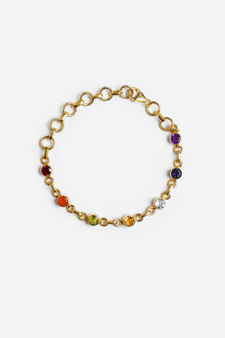 Inspired by balance and brilliance, the Inner Universe Multi-Gemstone Bracelet features a radiant sequence of bezel-set stones in a full spectrum of color. Set in 22k gold-plated sterling silver, this piece adds a vibrant yet refined touch to any look. A versatile design that celebrates your unique inner light.