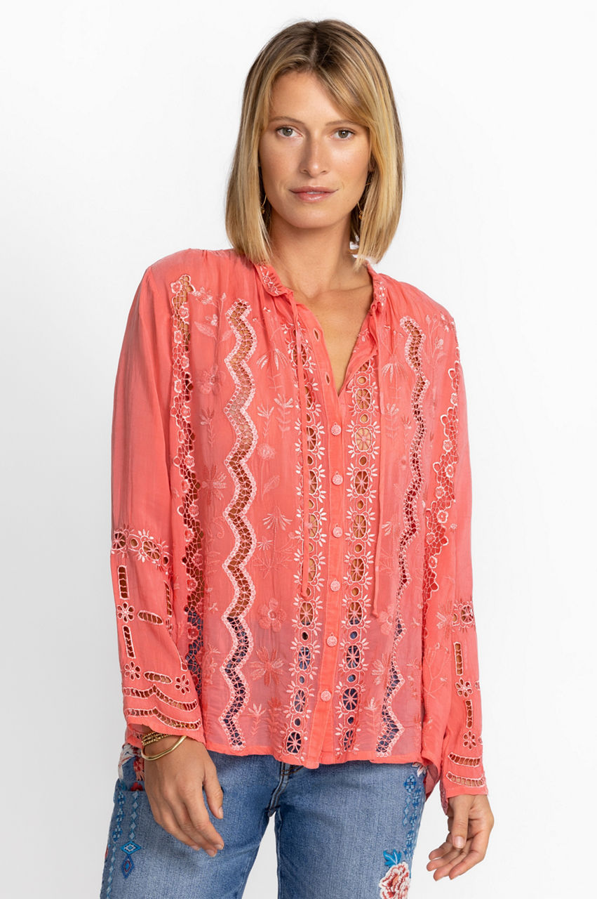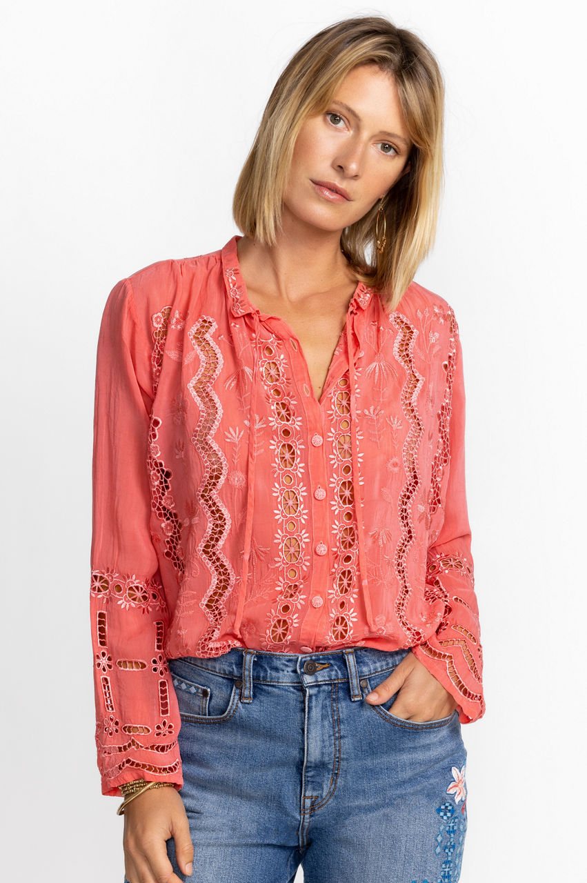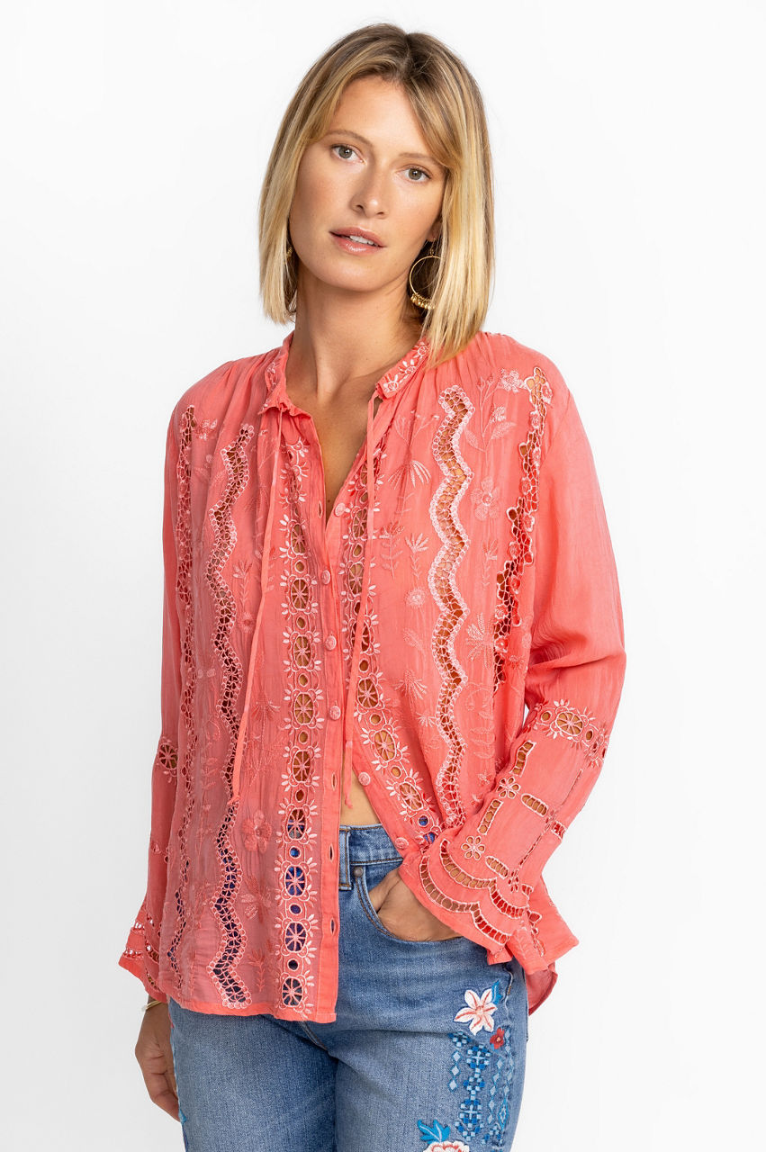 Embrace a free-spirited style this season with the Irini Blouse. Crafted from a comfortable material, this blouse boasts a round neck, long sleeves, a front fastening, and an intricate embroidery throughout. For a stylish yet pared-back daytime look, pair this blouse with white linen and leather extras.