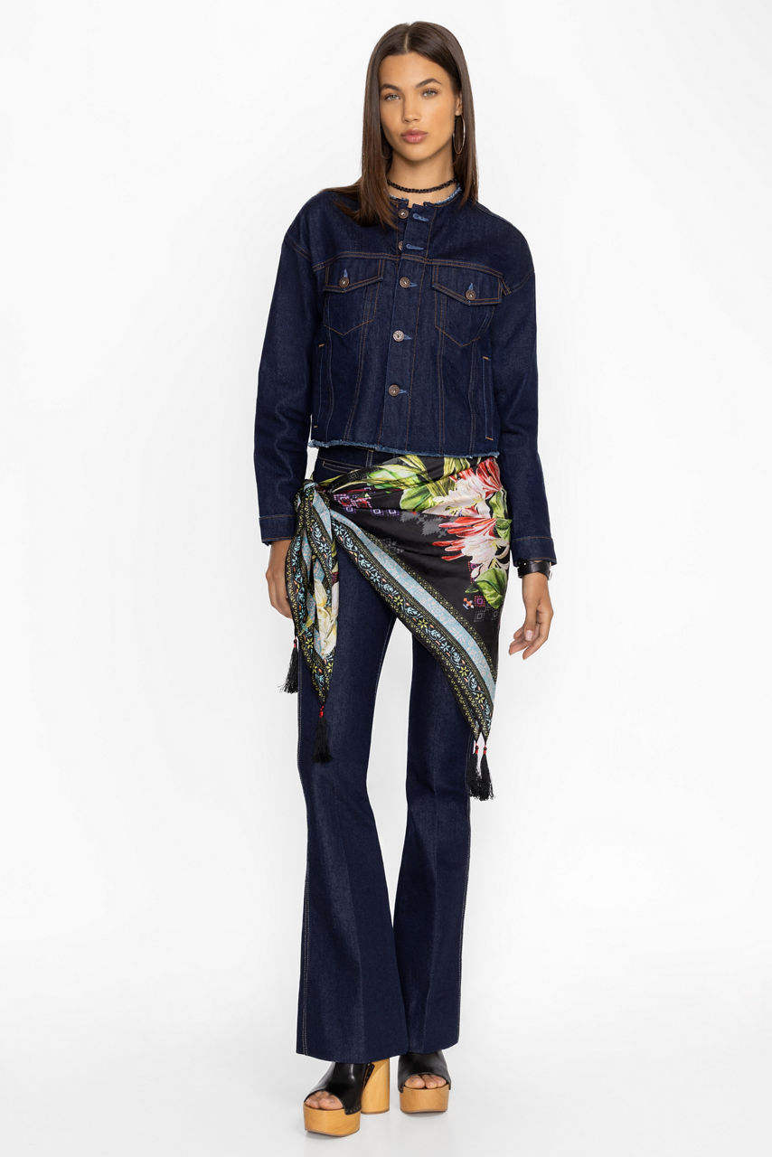 Crafted from 100% silk, the Iris Whisper Silk Scarf adds a touch of whimsy to any look. Featuring a variety of brilliant floral patterns against a rich black backdrop, this bold scarf is finished with decorative tassels at the corners. Add to a traditional work look for a bold pop of color.