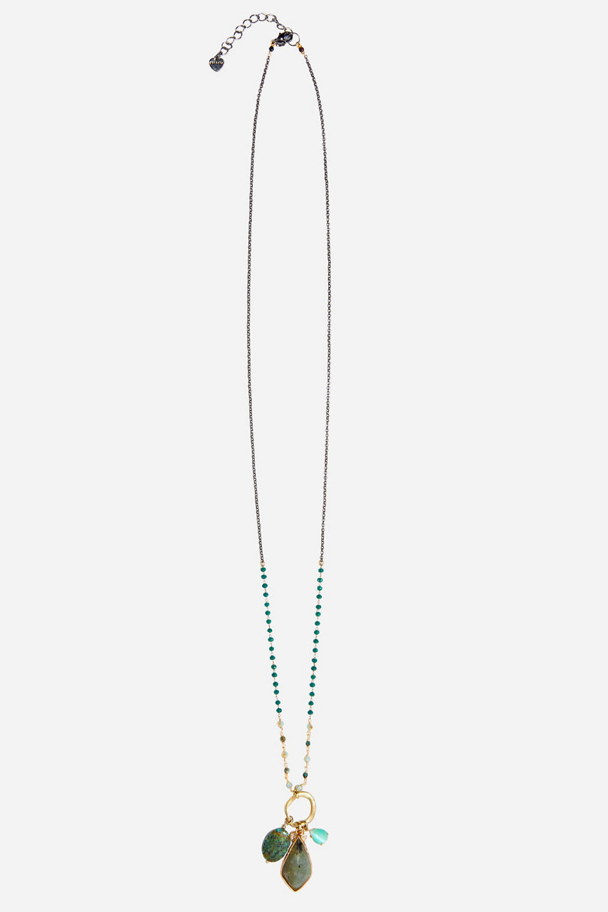 Our effortless and whimsical Isabel Charm Necklace features a delicate metallic chain accented with green and blue stones as well as charming and delightfully rustic verdant pieces as the centerpiece. The perfect finishing touch for any look, pair this gorgeous piece with a silk tunic and light-washed denim for an elevated boho look.