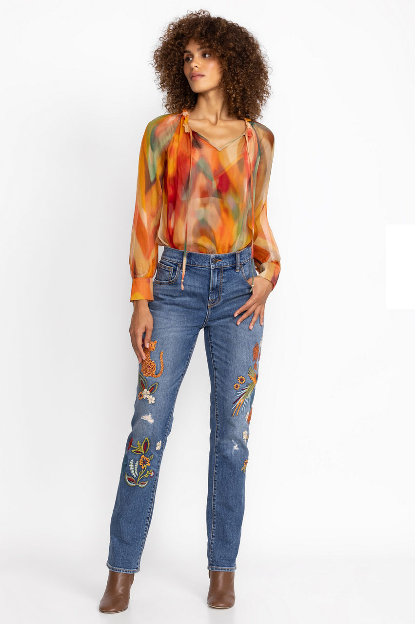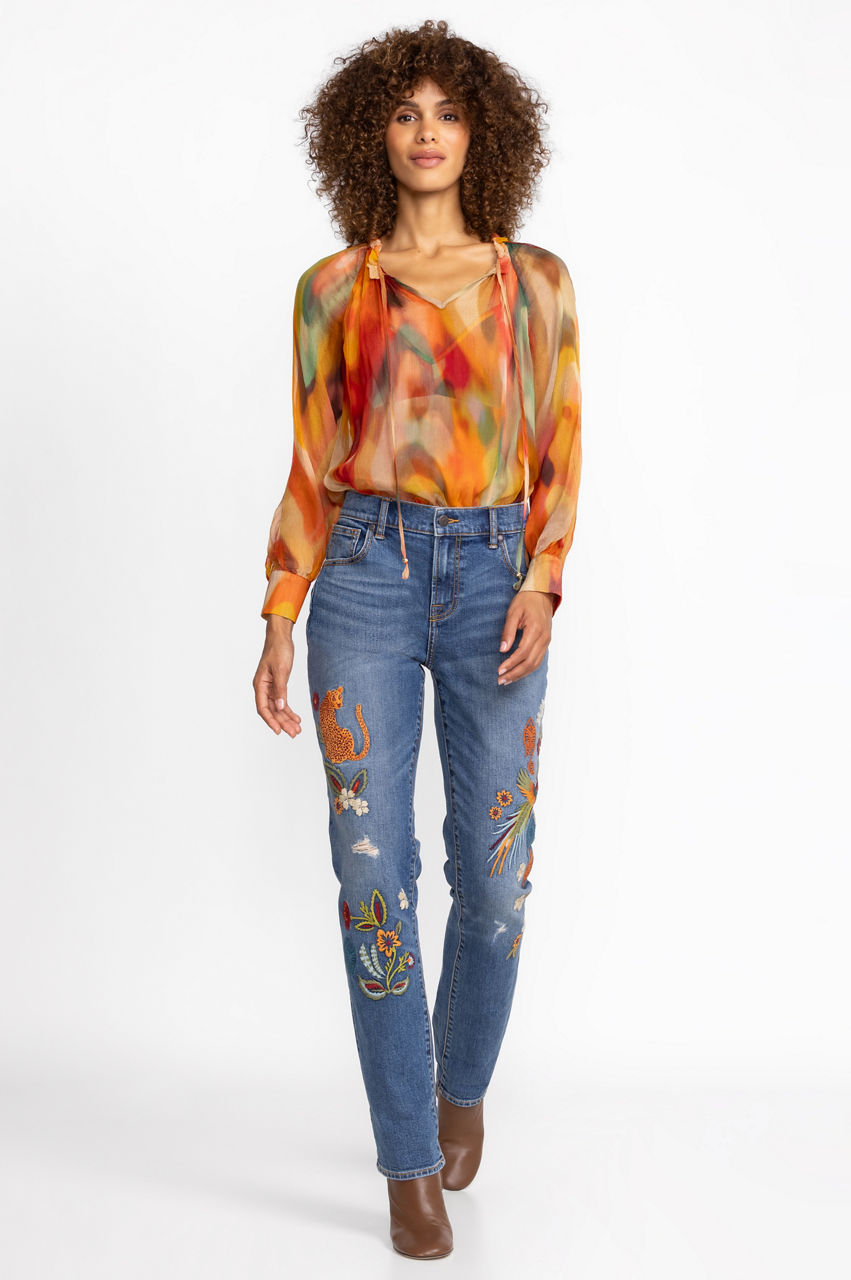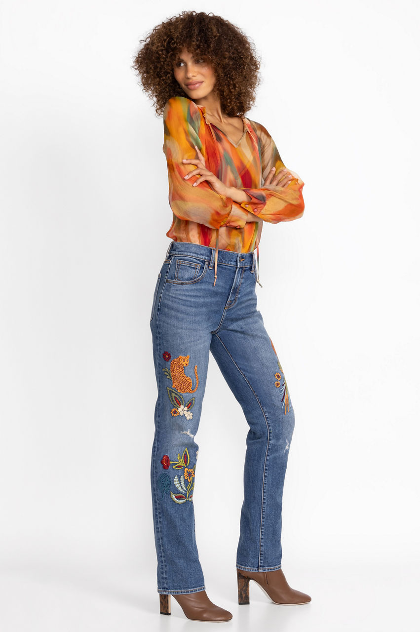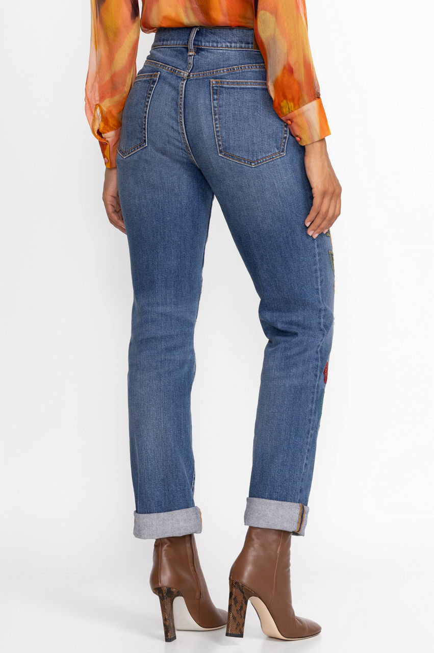 Putting a contemporary spin to a timeless denim silhouette, the Isabella Boyfriend Jeans effortlessly blend sophistication with laid-back comfort. Exquisitely fashioned from a cotton blend fabric, enhanced with a touch of stretch for superior comfort, these jeans feature intricate placement embroidery in vivid hues. Elevate your casual style with a pristine white button-down and trendy fashion sneakers, creating a captivating look that effortlessly captures attention.