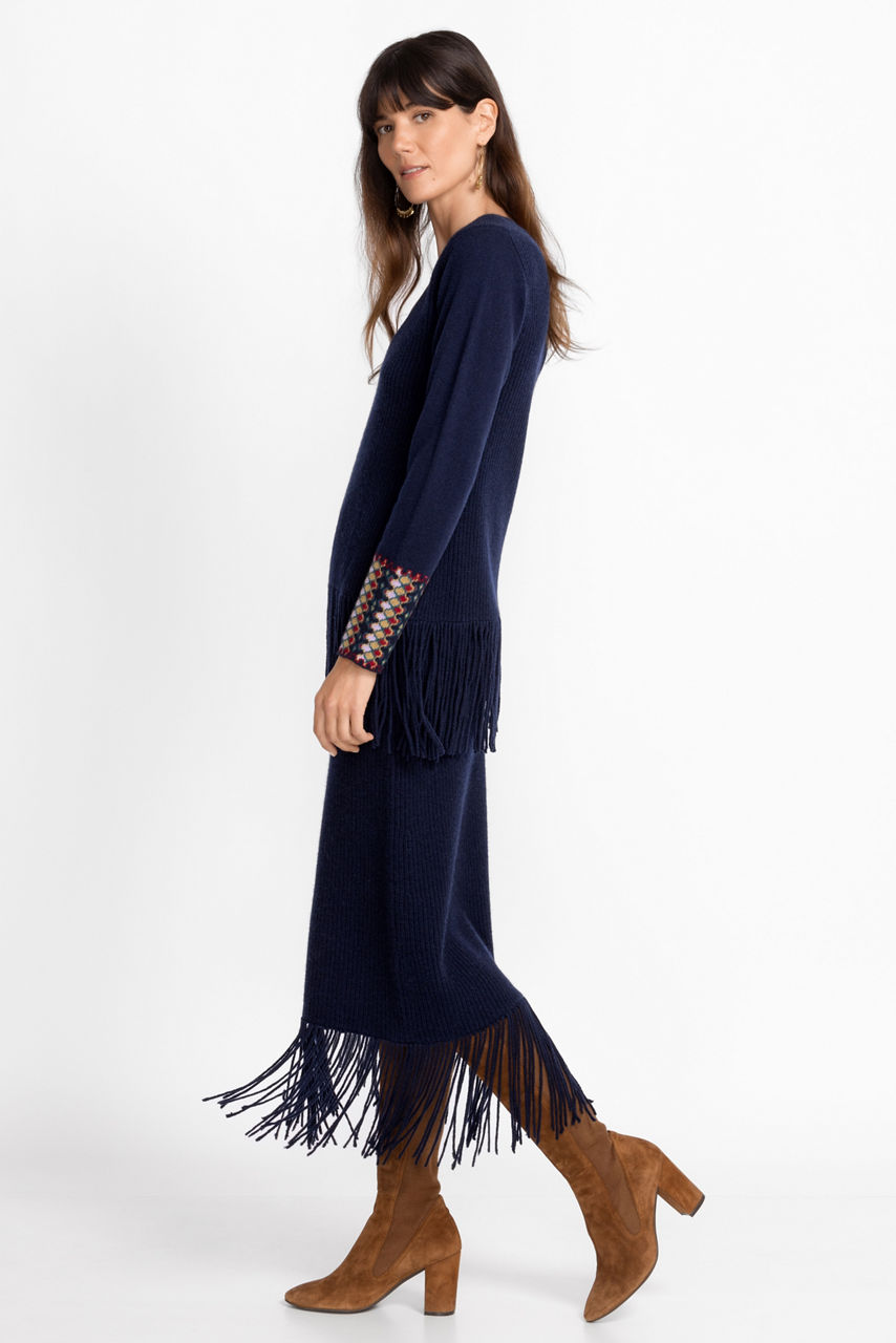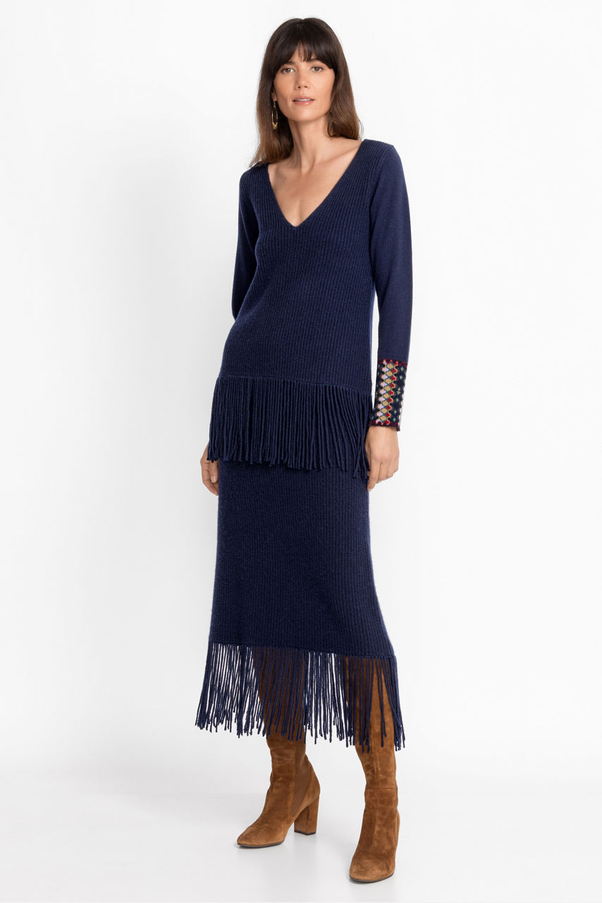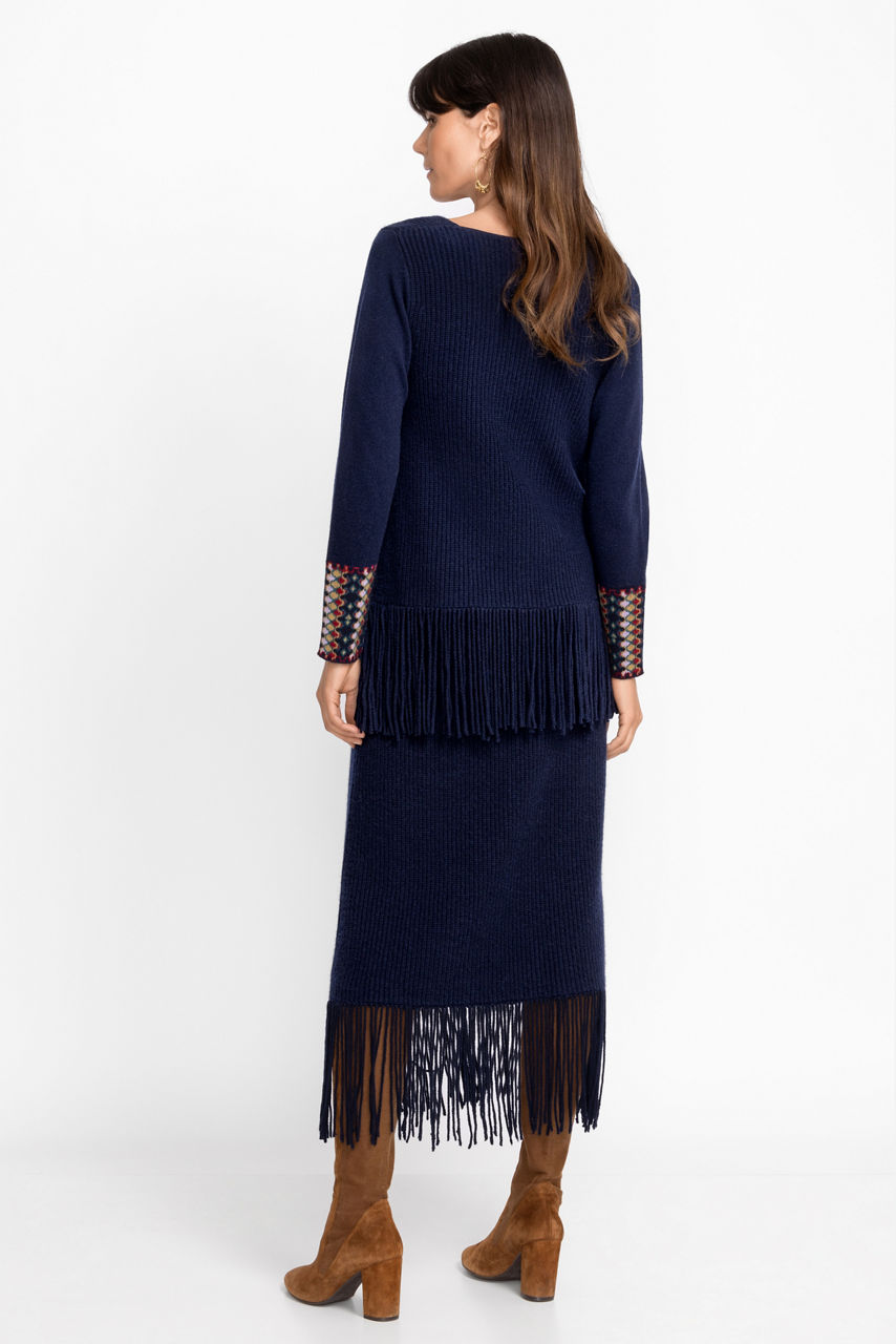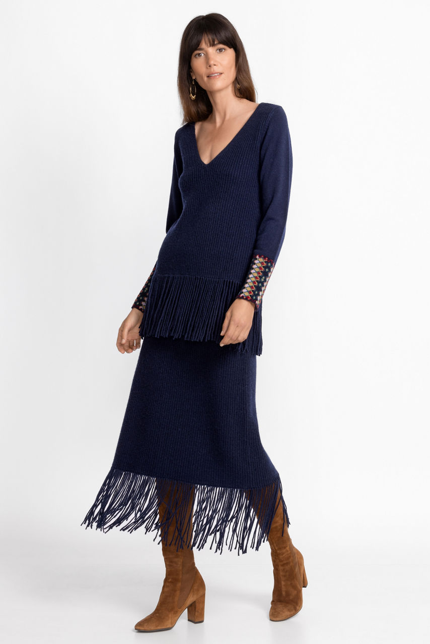 Created to stand out in a crowd, the Isadora Fringe Skirt offers a dazzling drape with each step you take. Carefully crafted from a cozy wool and cashmere blend, this midi-length skirt easily becomes the center of attention. Pair with the coordinating Isadora Fringe Top and knee-high boots for a dramatic look.