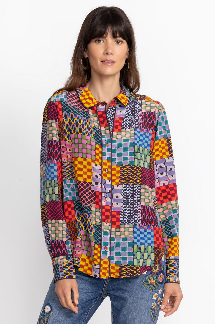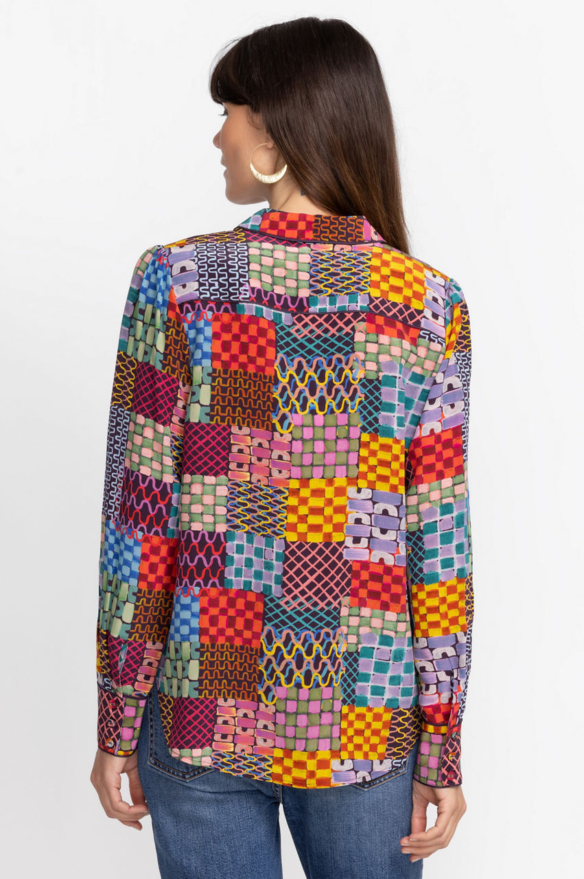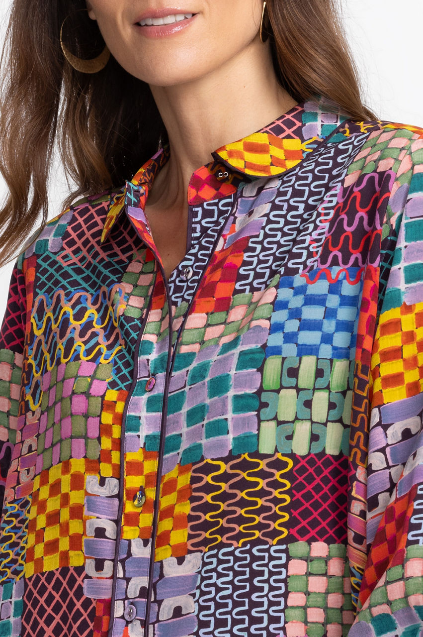 Offering a brilliant display of patchwork color, the Isadora Waves Silk Blouse is perfect for work or play. Featuring a button front and slightly puffed sleeves, this vivid graphic blouse adds spice to any look. Pair with denim trousers and strappy wedge heels for a fun weekend brunch with friends.