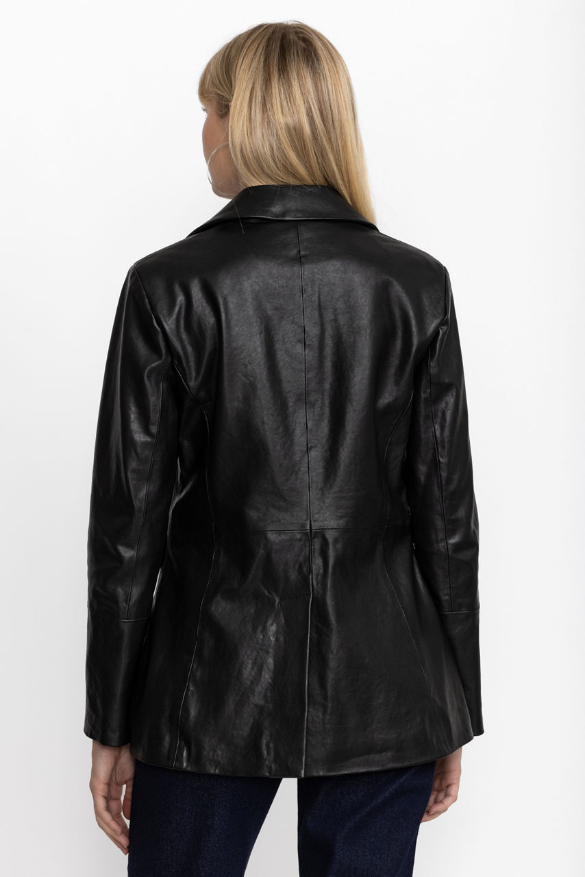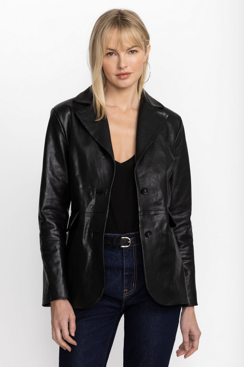The Italian leather blazer offers a fresh feminine take on a classic masculine suiting jacket. Crafted from 100% Italian leather, this blazer features a wide, notched lapel, button closure, and detailed flap pockets at the hip. Layer over a bold blouse and pair with flowing silk pants for a unique textured look.