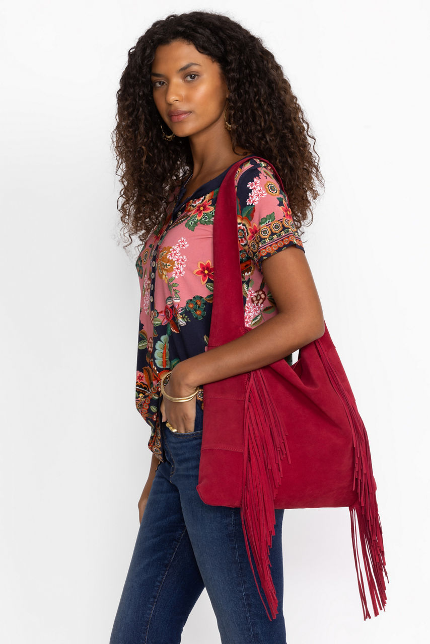 Offering a modern take on a classic hobo bag, the Italian Suede Fringe Hobo adds unique flair to your look. Crafted from 100% suede, this bag features a single wide shoulder strap and playful fringe embellishments for a finished look that is alive with constant movement. Pair with a denim-on-denim look and trendy ankle boots for a fresh styling.