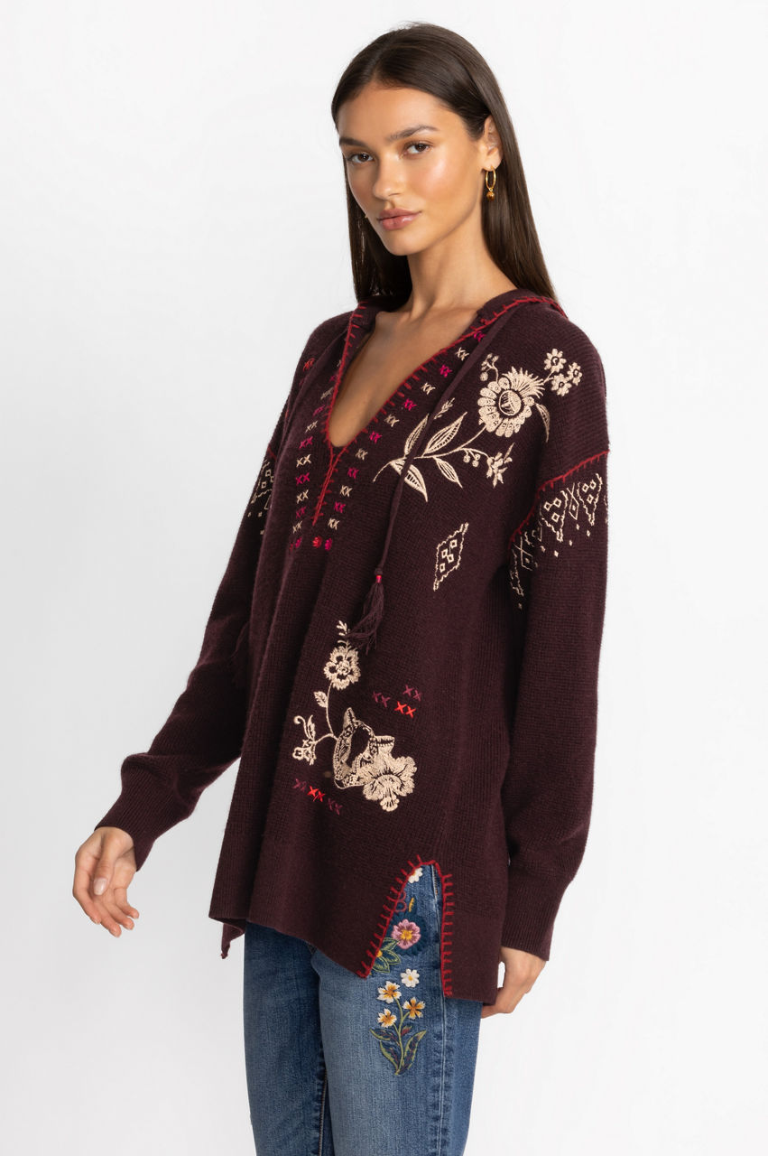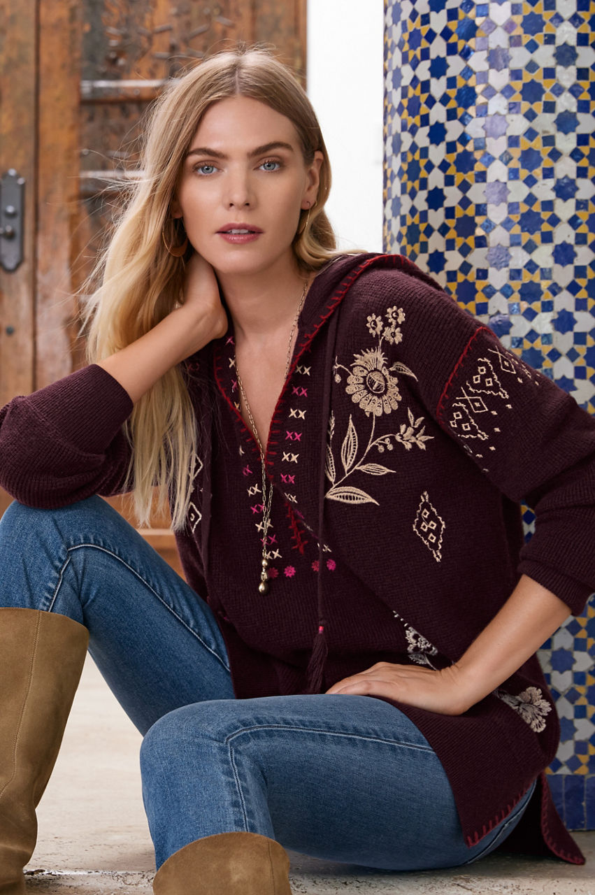 Spun from a sumptuous wool cashmere blend, the Ivery Baja Pullover is reminiscent of cozy, cold-weather days nestled in front of the fire. This pullover boasts a V-neck, a hood, long sleeves, ribbed edges, and an intricate placement embroidery consisting of fragrant blooms. Style this pullover with a long sleeve tee and pair with jeans for a laid-back wear-anywhere look.
