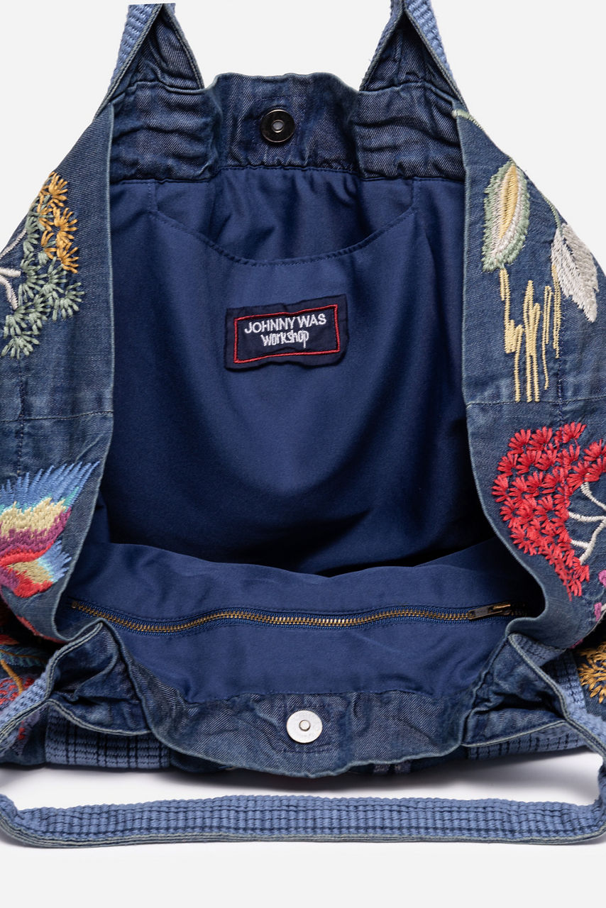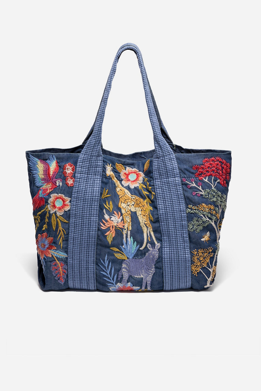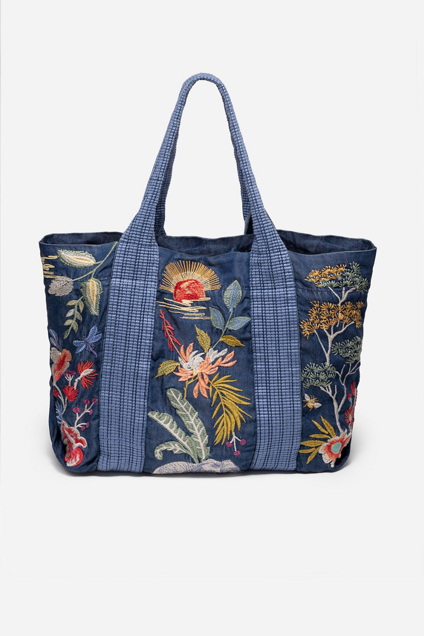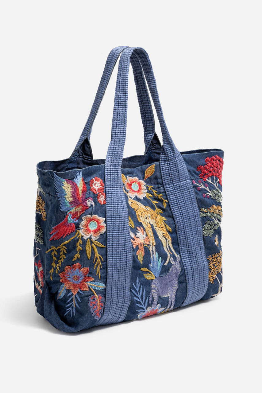 Embellished with brilliant placement embroidery featuring vibrant flora and fauna, the Jane Shopper Tote offers an elevated casual daily bag. Crafted from a lightweight, denim-like fabric, this unique bag is finished with a magnetic top closure and an interior pocket to store all of your essentials. Pair with casual sportswear and sneakers for a day of errands.