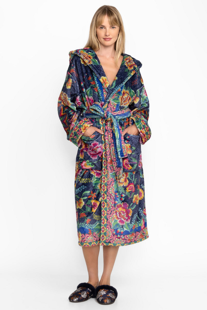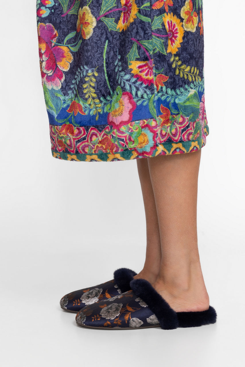 Carefully crafted for cozy comfort, the Navy Jacquard Slippers are elevated loungewear. Lined with navy faux fur, these unique slippers are finished with intricate floral detailing at the toe for a bold accent. Pair with soft pajamas and a silk robe for an enjoyable evening in.