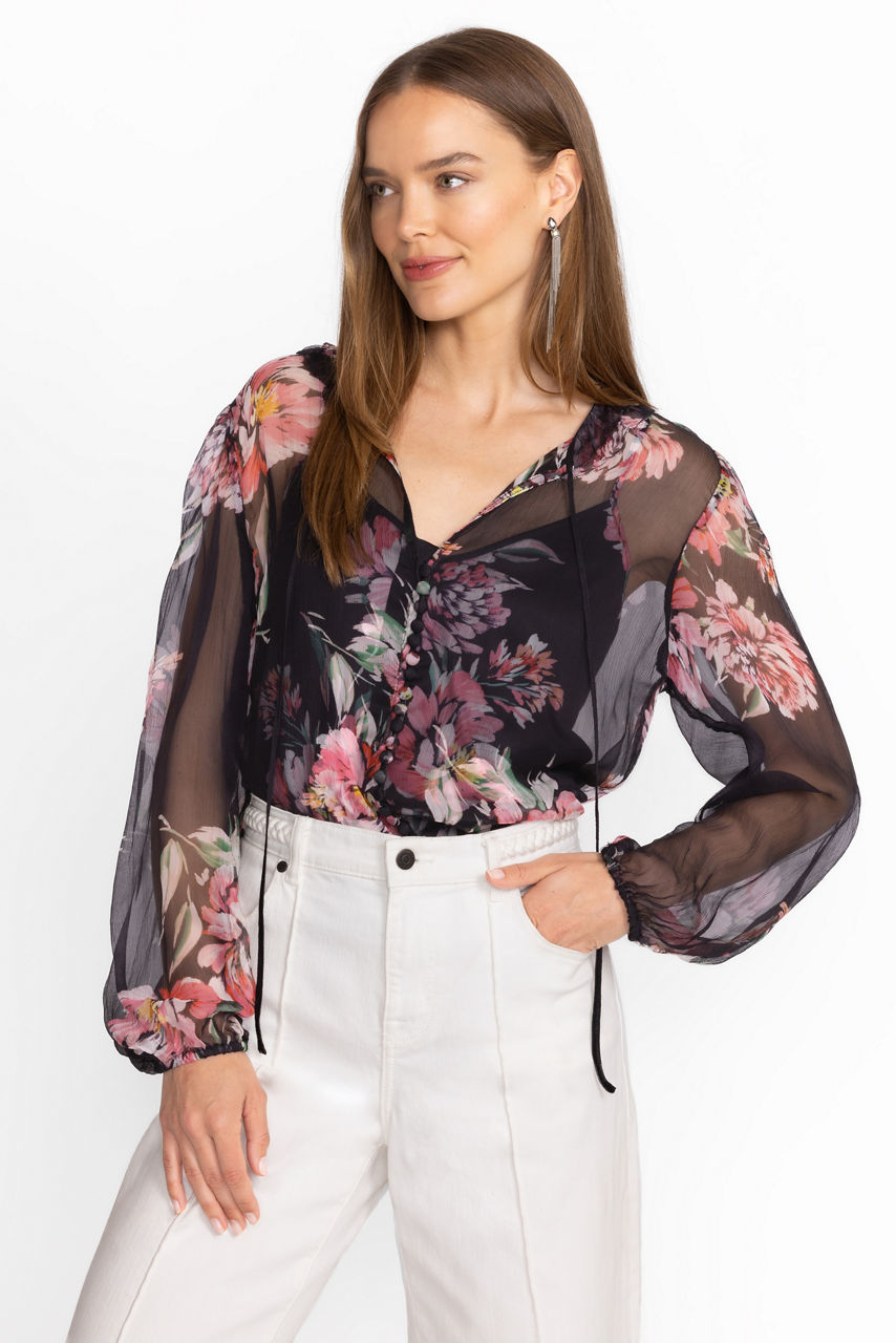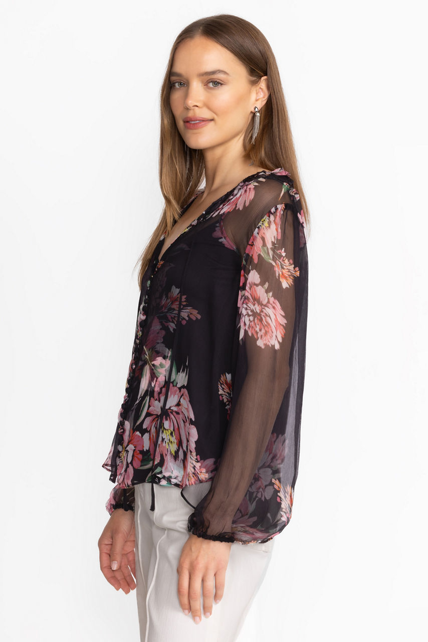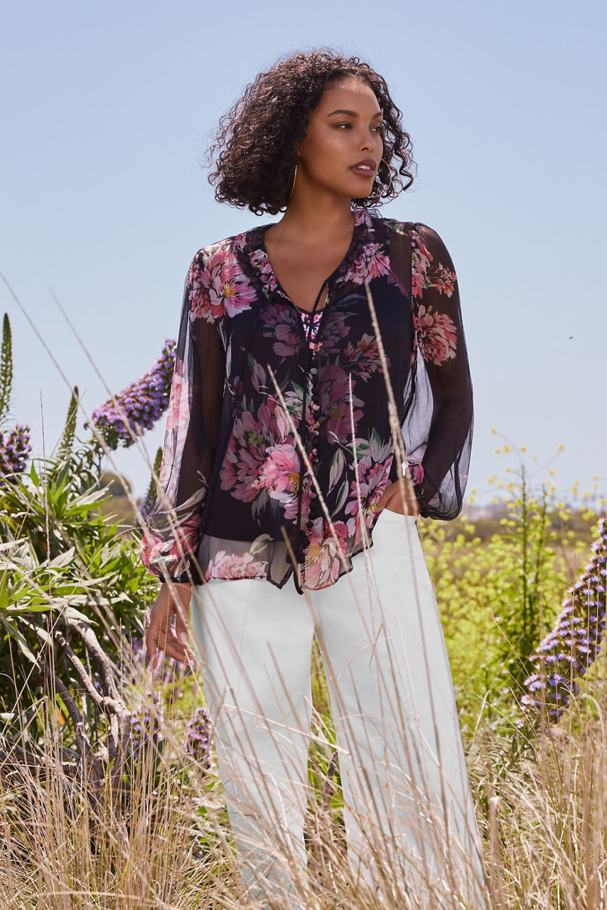 Crafted from 100% sumptuous silk, the Jaycee Peasant Blouse is adorned with delicate pink floral blooms. Featuring intricate ruffles at the neck and gathered sleeves, this slip-lined blouse is finished with fabric covered buttons and loops. Pair with a classic pencil skirt and black pumps for a polished workday ensemble.